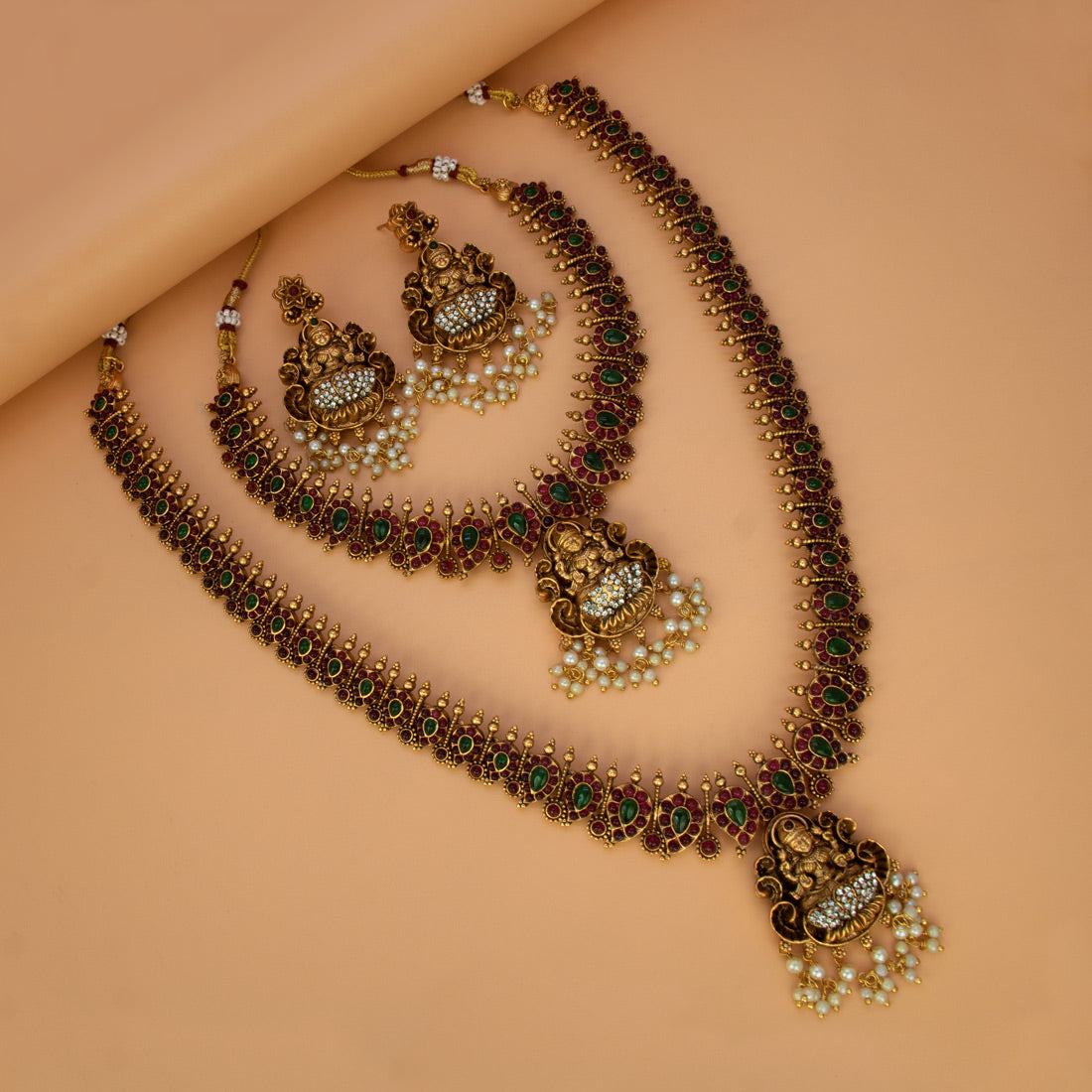 मैट गोल्ड प्लेटिंग सेट को एक प्रामाणिक प्राचीन फिनिश प्रदान करती है, जो पारंपरिक मंदिर आभूषण की याद दिलाती है ।