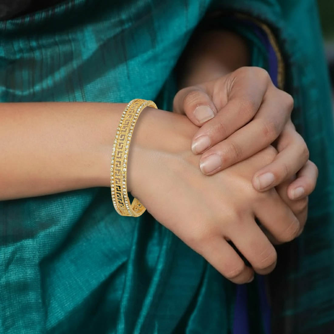 महिलाओं के लिए इस क्लासिक ग्रीक की गोल्ड प्लेटेड अमेरिकन डायमंड चूड़ी में अपनी खूबसूरती का जादू बिखेरें। इसमें चमकदार स्टोन और कालातीत डिज़ाइनर पैटर्न है—किसी भी उत्सव या रोज़मर्रा के स्टाइल के लिए बिल्कुल सही। यह फैशन ज्वेलरी आपके हाथों की खूबसूरती में चार चाँद लगा देगी। यह महिलाओं के लिए सालगिरह, जन्मदिन, क्रिसमस आदि पर एक आदर्श उपहार है।