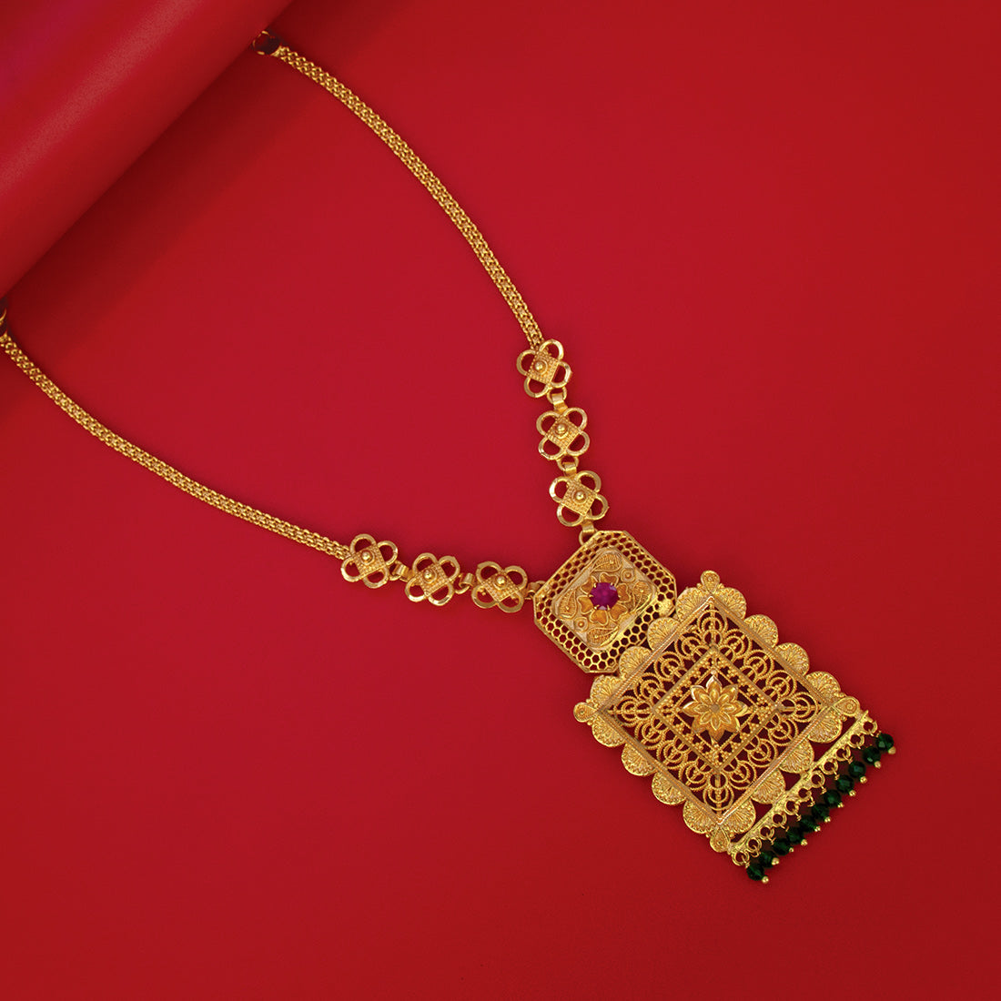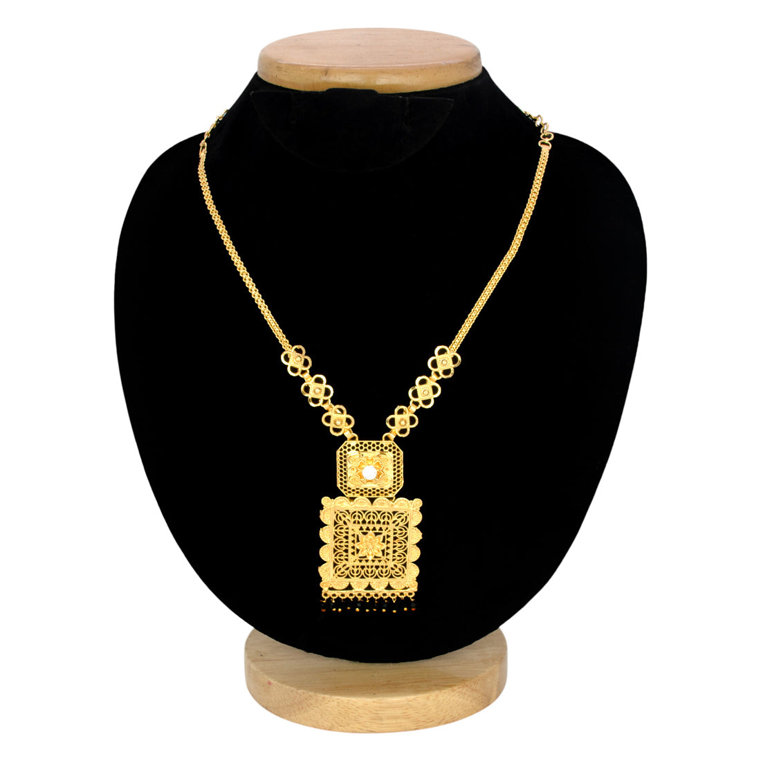 सोने की परत चढ़ा हुआ डिज़ाइनर पेंडेंट नेकलेस, जिसमें बारीक फ़िलिग्री का काम है
