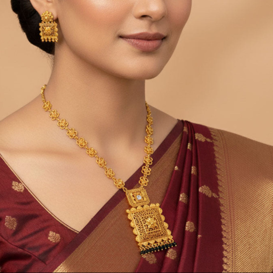 प्रत्येक प्रकार को काले, हरे या लाल रंग के नाज़ुक मोतियों की बूंदों से खूबसूरती से सजाया गया है, जो इसे शादियों, उत्सवों और सांस्कृतिक समारोहों के लिए एक आदर्श सहायक वस्तु बनाता है। हल्का होने के साथ-साथ, यह आकर्षक नेकलेस साड़ियों, लहंगों और अन्य पारंपरिक परिधानों के साथ आसानी से मेल खाता है और आपके लुक में एक शाही आकर्षण जोड़ता है।