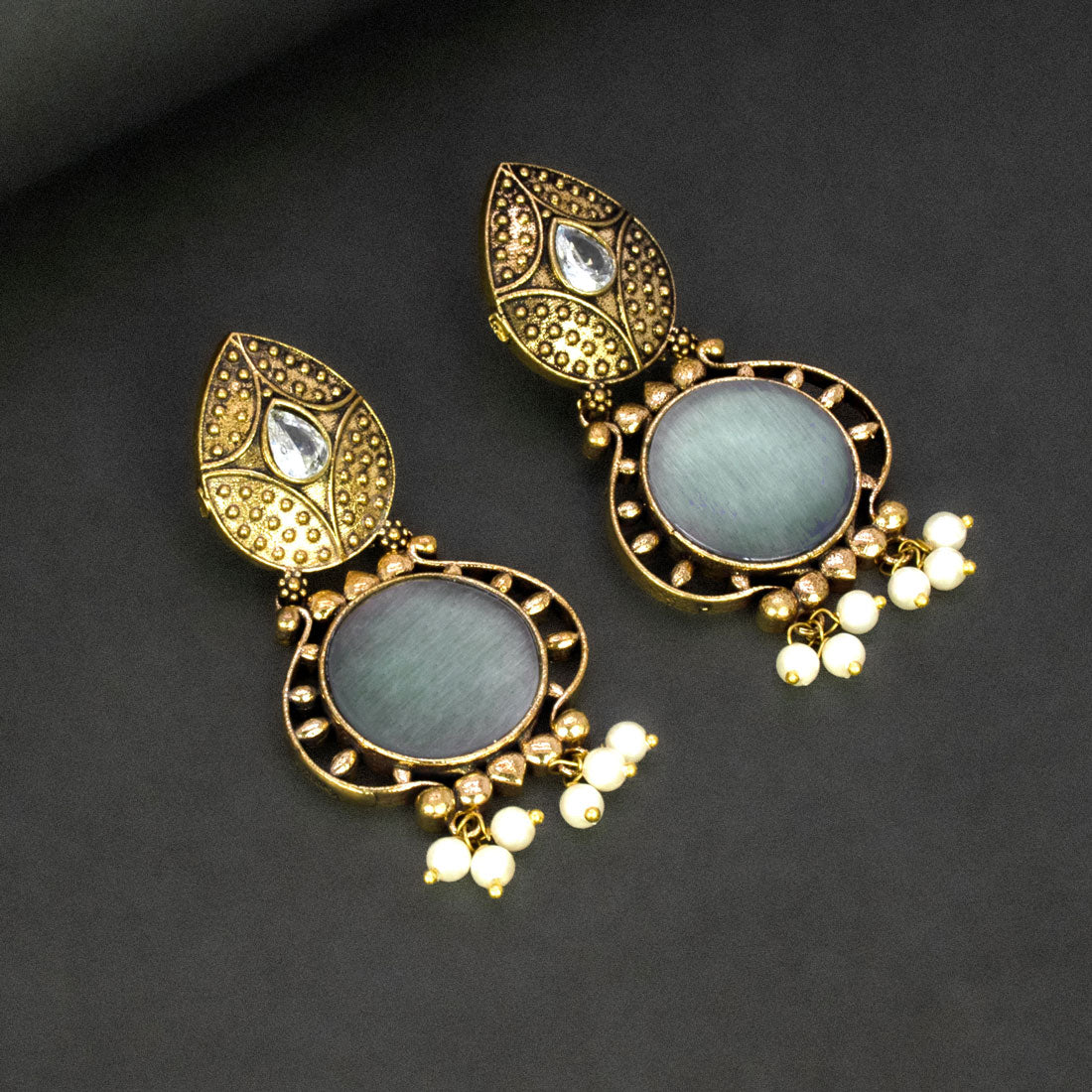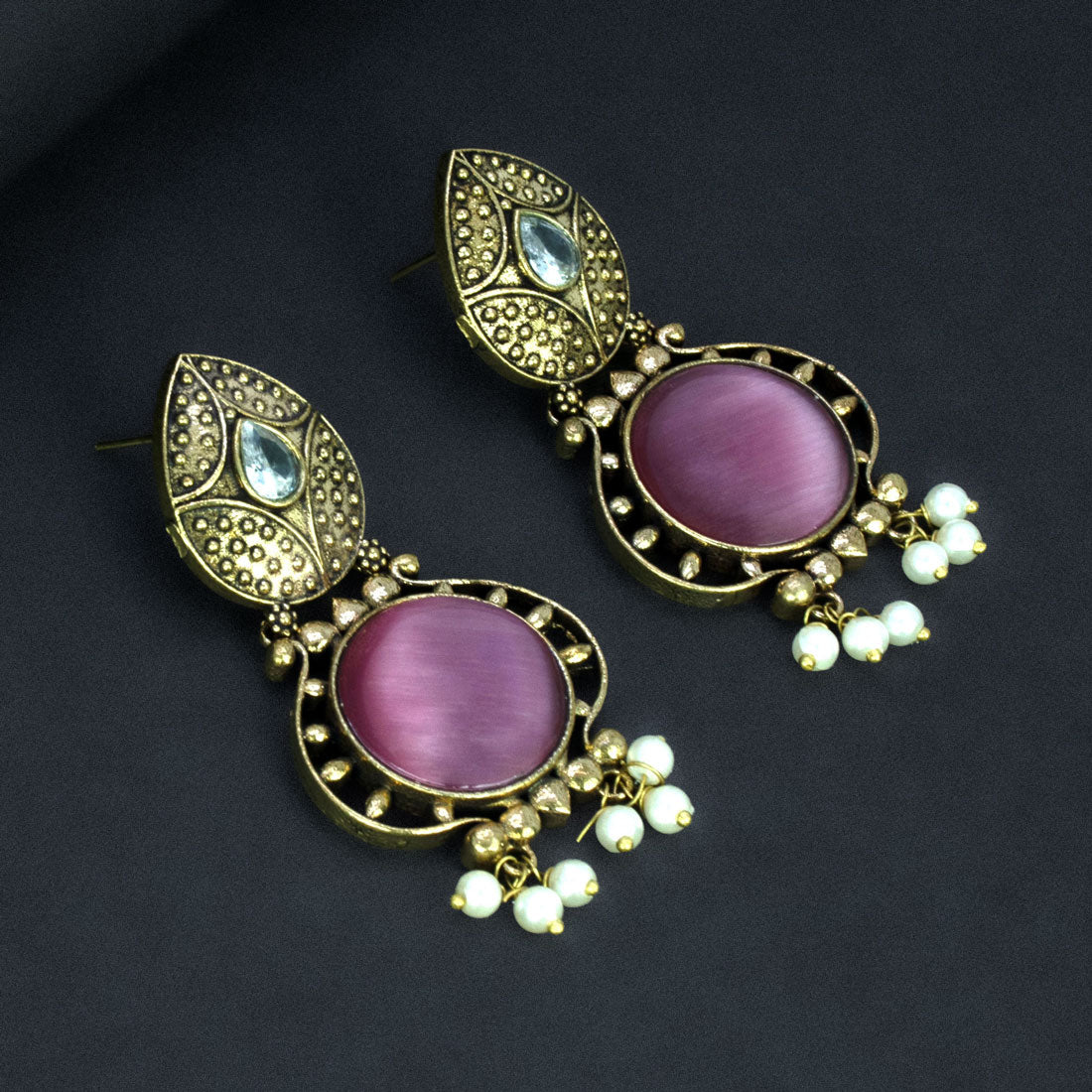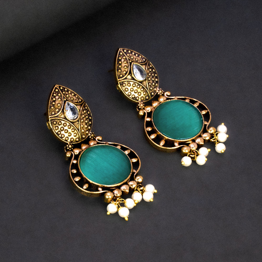 विंटेज-प्रेरित एंटीक फ़िनिश वाले फैशन गोल्डन ऑक्सीडाइज़्ड मोनालिसा स्टोन इयररिंग्स। कई आकर्षक रंगों में उपलब्ध, ये बहुमुखी एक्सेसरीज़ पारंपरिक एथनिक परिधानों और उत्सवों के अवसरों के साथ खूबसूरती से मेल खाते हैं।
