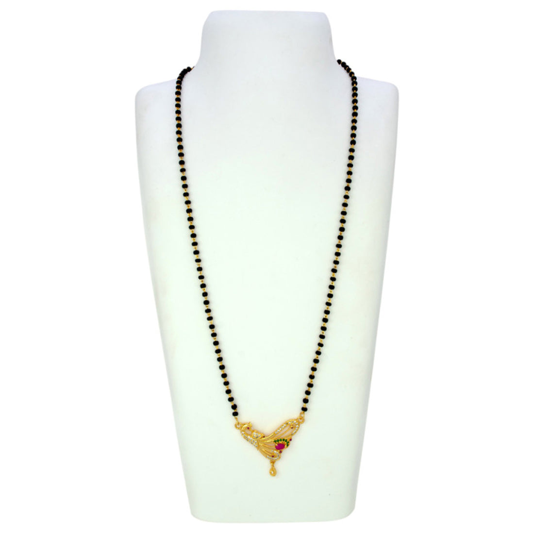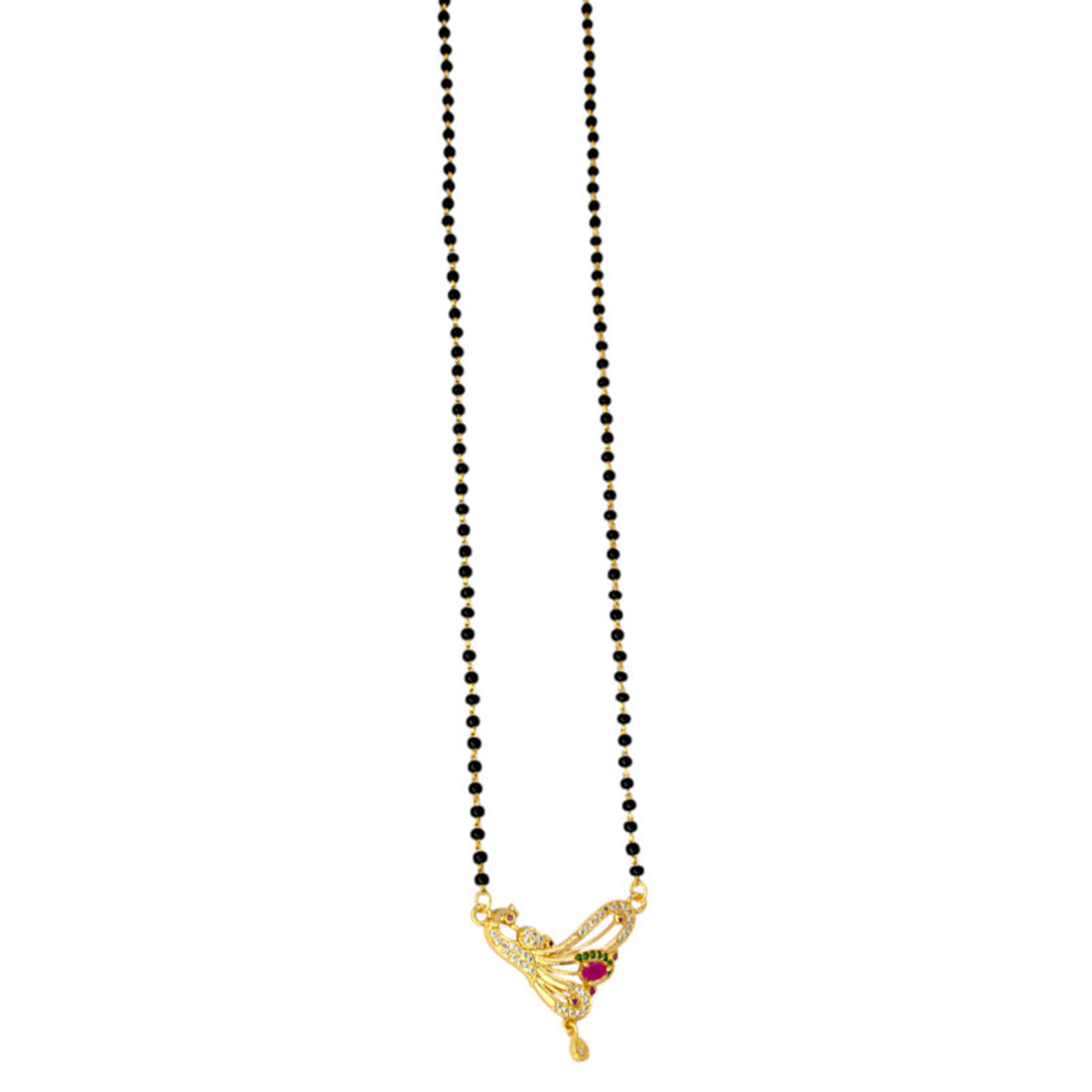 एक स्टाइलिश गोल्ड प्लेटेड मोर पेंडेंट मंगलसूत्र चेन जिसमें खूबसूरती से डिज़ाइन किया गया मोर पेंडेंट है, जो चमकदार सीजेड और रूबी पन्ना पत्थरों से सुशोभित है, जिसे पारंपरिक काले मनके चेन के साथ जोड़ा गया है।