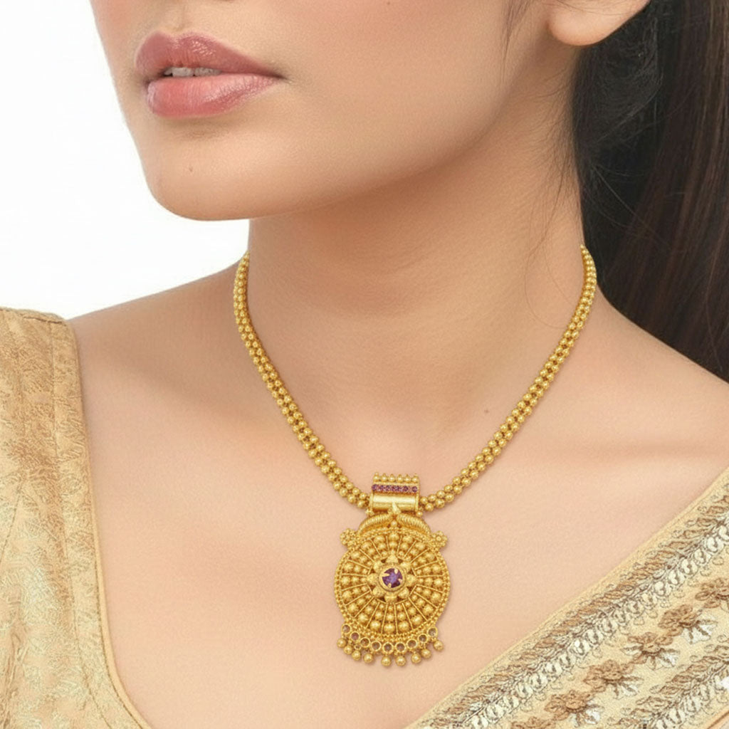 पेंडेंट के आधार पर लगे नाज़ुक मनके इसकी पारंपरिक सुंदरता को और निखारते हैं, जिससे यह उत्सवों, शादियों और सांस्कृतिक कार्यक्रमों के लिए एक बेहतरीन एक्सेसरी बन जाता है। हल्का लेकिन आकर्षक, यह नेकलेस साड़ियों, लहंगों और अन्य पारंपरिक परिधानों के साथ आसानी से मेल खाता है, और आपके लुक में चार चाँद लगा देता है।