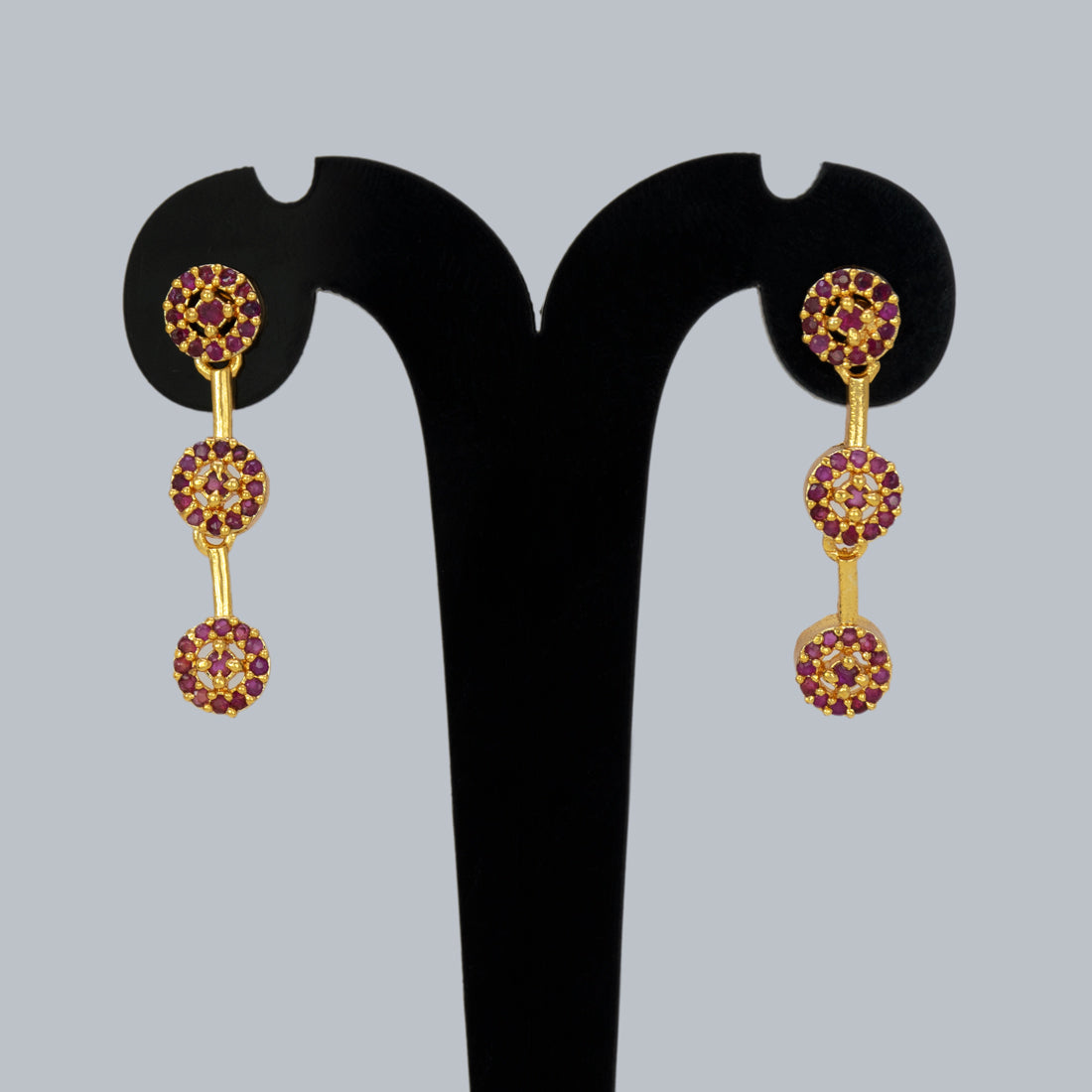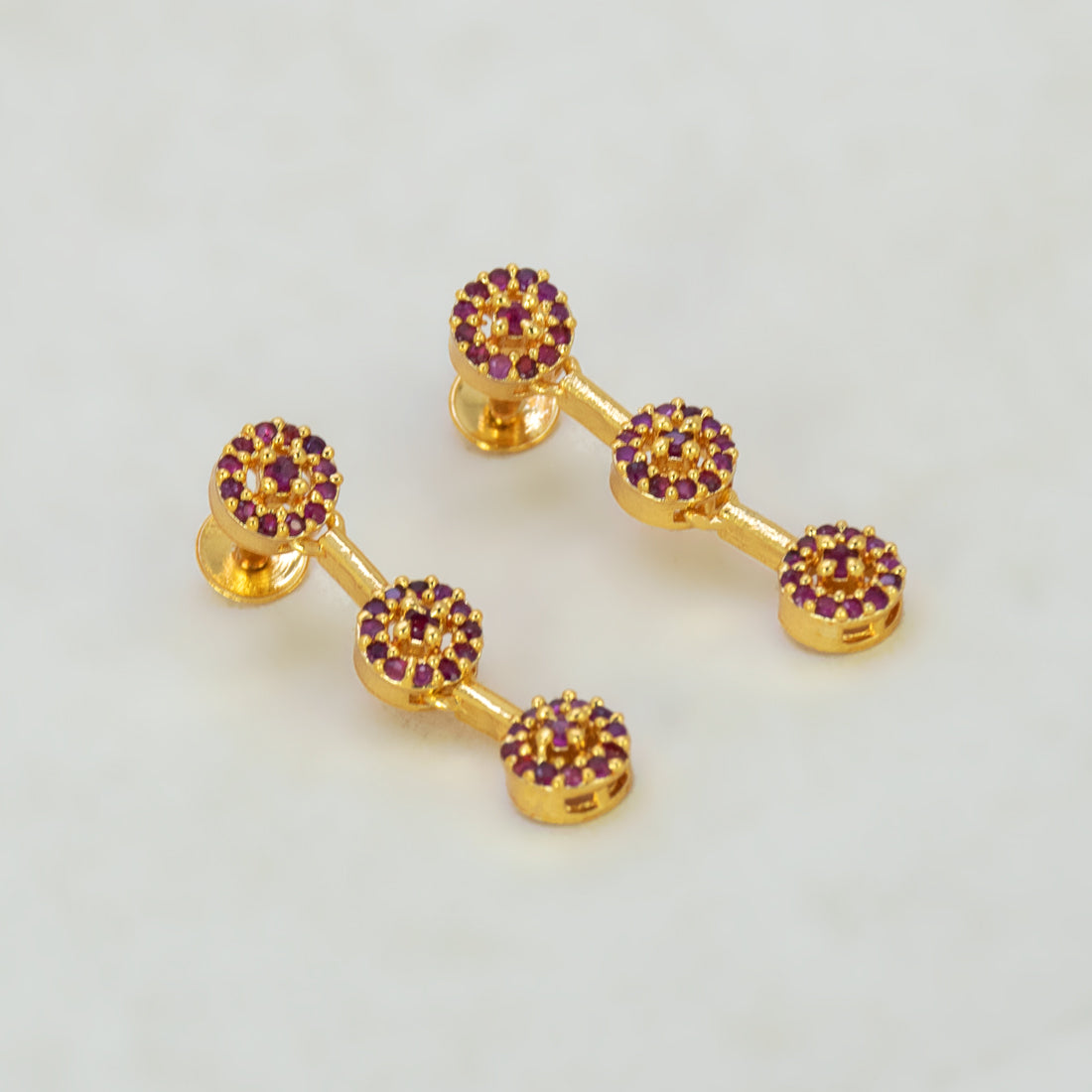 चमकदार अमेरिकी हीरों से जड़े स्टाइलिश गोल्ड-प्लेटेड ट्रिपल फ्लोरल सीजेड ड्रॉप इयररिंग्स। पार्टियों, शादियों और त्योहारों के लिए एक आदर्श एक्सेसरी।