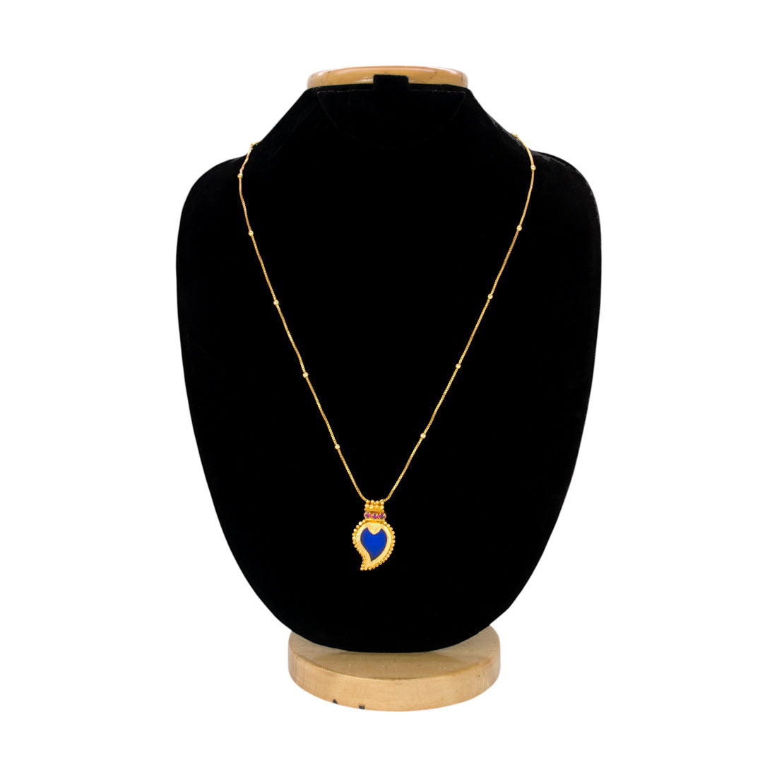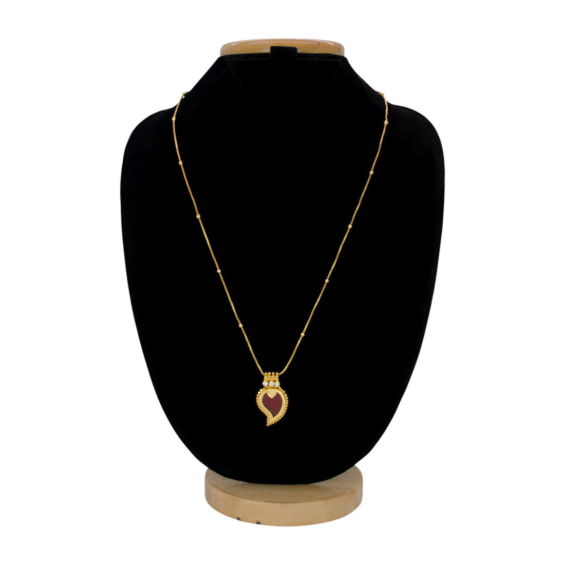 लड़कियों के लिए पारंपरिक छोटी गोल्ड प्लेटेड मैंगो पेंडेंट चेन। केरल का पारंपरिक गोल्ड प्लेटेड पेंडेंट, सिंथेटिक रूबी/सीज़ेड रत्नों से जड़ा हुआ, सुनहरे डिज़ाइनर मोतियों वाली एक पतली बॉक्स चेन में। यह नकली पेंडेंट और चेन निश्चित रूप से हर महिला के आभूषण संग्रह का एक अनमोल हिस्सा होगा। इस खूबसूरत पेंडेंट चेन को पार्टियों, शादियों या सगाई समारोहों में किसी भी एथनिक परिधान के साथ पहनें।