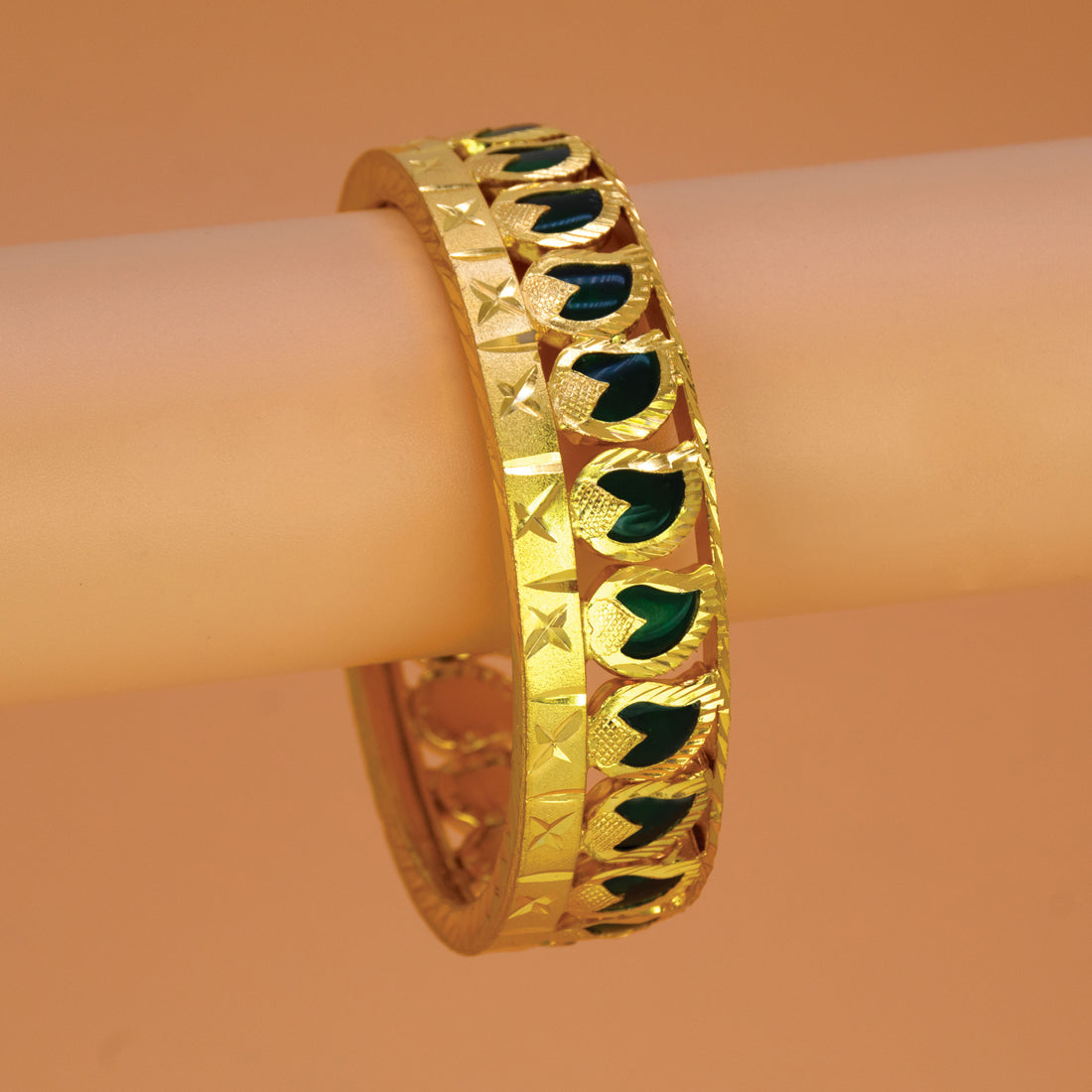 സ്ത്രീകൾക്കുള്ള മനോഹരമായ പരമ്പരാഗത പച്ച മാമ്പഴ വളകൾ. ഈ പരമ്പരാഗത കേരളീയ വിവാഹ വള പരമ്പരാഗത മാങ്ങാ മാലയ്ക്കൊപ്പം ഉത്സവ അവസരങ്ങളിലും വിവാഹ ചടങ്ങുകളിലും പരമ്പരാഗത വസ്ത്രങ്ങൾക്കൊപ്പം നന്നായി യോജിക്കുന്നു.