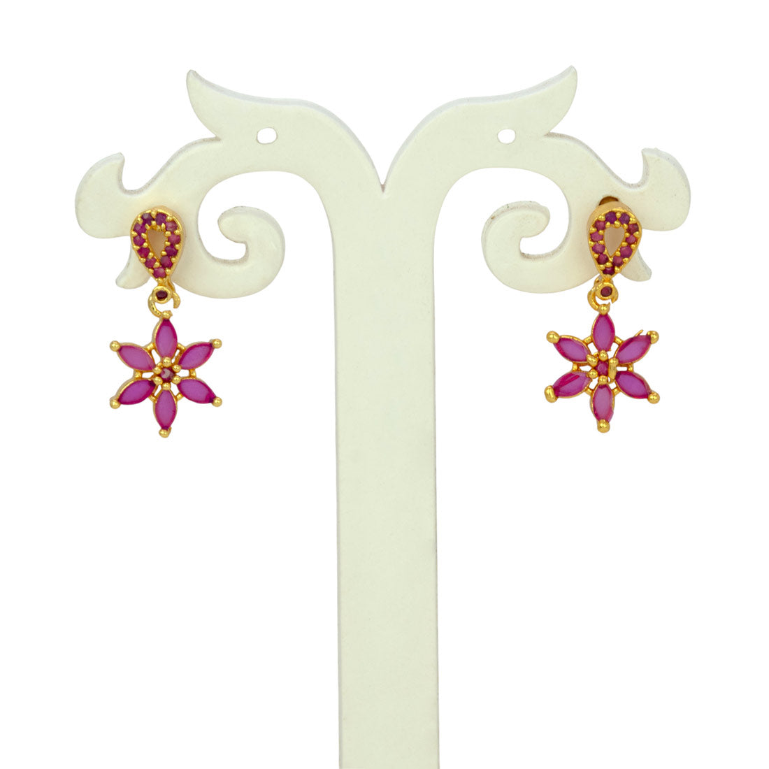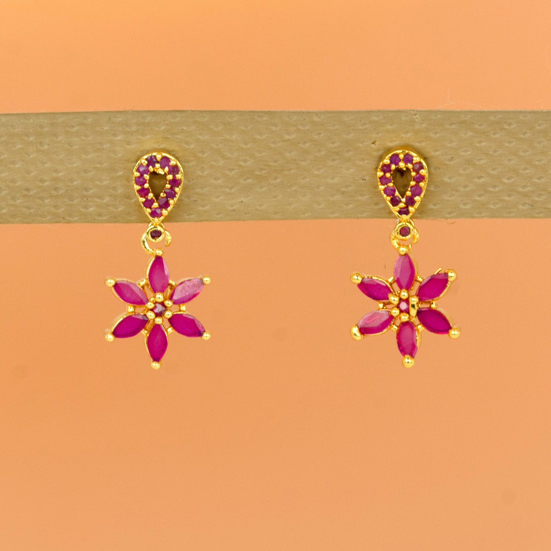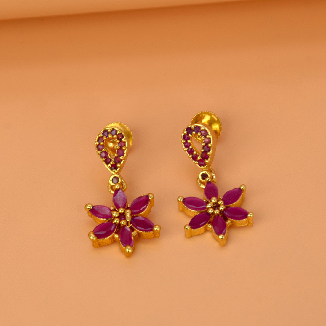 സ്റ്റൈലിഷ് ഡ്രോപ്പ് ഡിസൈൻ സ്റ്റഡുള്ള ആകർഷകമായ സ്വർണ്ണം പൂശിയ റൂബി പുഷ്പ ഡ്രോപ്പ് കമ്മലുകൾ. ഭാരം കുറഞ്ഞതും, മനോഹരവും, ഏത് അവസരത്തിനും ആധുനികമോ പരമ്പരാഗതമോ ആയ വസ്ത്രങ്ങൾ ധരിക്കുന്ന പെൺകുട്ടികൾക്കും സ്ത്രീകൾക്കും അനുയോജ്യം. സ്ക്രൂ ടൈപ്പ് ബാക്ക്.