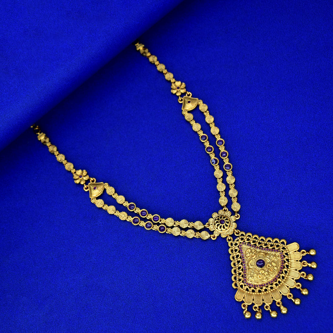 അലങ്കാര വിശദാംശങ്ങളും മനോഹരമായ നിറമുള്ള കല്ലുകളും ഉള്ള ഇരട്ട-ചരടുകളുള്ള സ്വർണ്ണ പൂശിയ രൂപകൽപ്പന ഉൾക്കൊള്ളുന്ന ഒരു രാജകീയ, വിക്ടോറിയൻ ആന്റിക് ഡ്യുവൽ-സ്ട്രാൻഡ് സ്റ്റോൺ നെക്ലേസ്. ആഡംബരപൂർണ്ണമായ ആന്റിക് ഫിനിഷും പരമ്പരാഗത മോട്ടിഫുകളും വിവാഹങ്ങൾക്കും ഉത്സവങ്ങൾക്കും സാംസ്കാരിക പരിപാടികൾക്കും അനുയോജ്യമാക്കുന്നു. വൈവിധ്യമാർന്ന സ്റ്റൈലിംഗിനായി സിന്തറ്റിക് മരതകം, റൂബി സ്റ്റോൺ ഓപ്ഷനുകളിൽ ലഭ്യമാണ്.