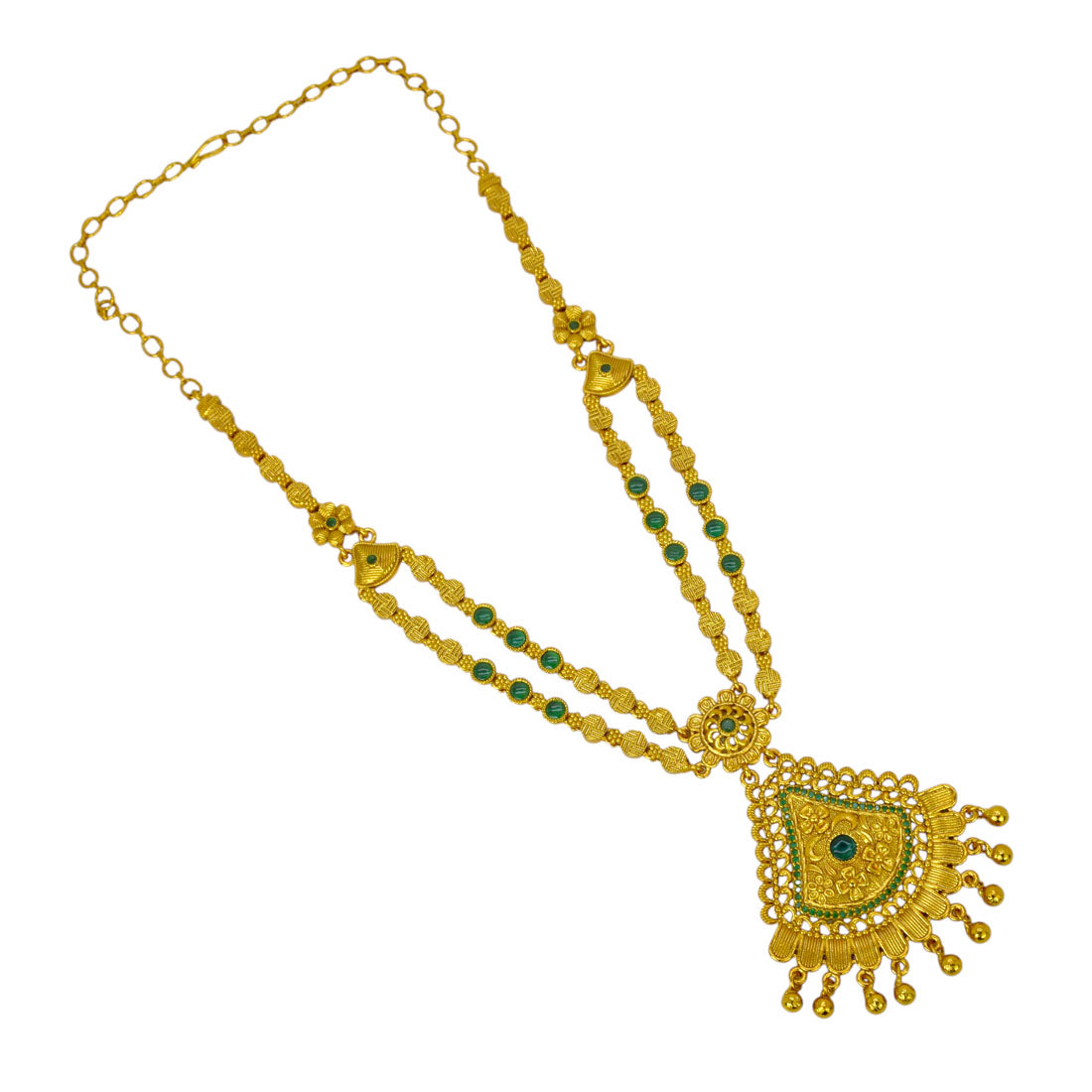 സമ്പന്നമായ സ്വർണ്ണം പൂശിയ ആന്റിക് ഫിനിഷിൽ രൂപകൽപ്പന ചെയ്തതും റൂബി അല്ലെങ്കിൽ എമറാൾഡ് കല്ലുകൾ കൊണ്ട് അലങ്കരിച്ചതുമായ ഒരു പരമ്പരാഗത വിക്ടോറിയൻ ആന്റിക് ഡ്യുവൽ-സ്ട്രാൻഡ് സ്റ്റോൺ നെക്ലേസ്. ഇതിന്റെ ഇരട്ട-പാളി ശൃംഖല, പുഷ്പ രൂപങ്ങൾ, അലങ്കരിച്ച പെൻഡന്റ് എന്നിവ സാംസ്കാരികവും ഉത്സവവുമായ അവസരങ്ങൾക്ക് അനുയോജ്യമായ ഒരു ആക്സസറിയാണ്.