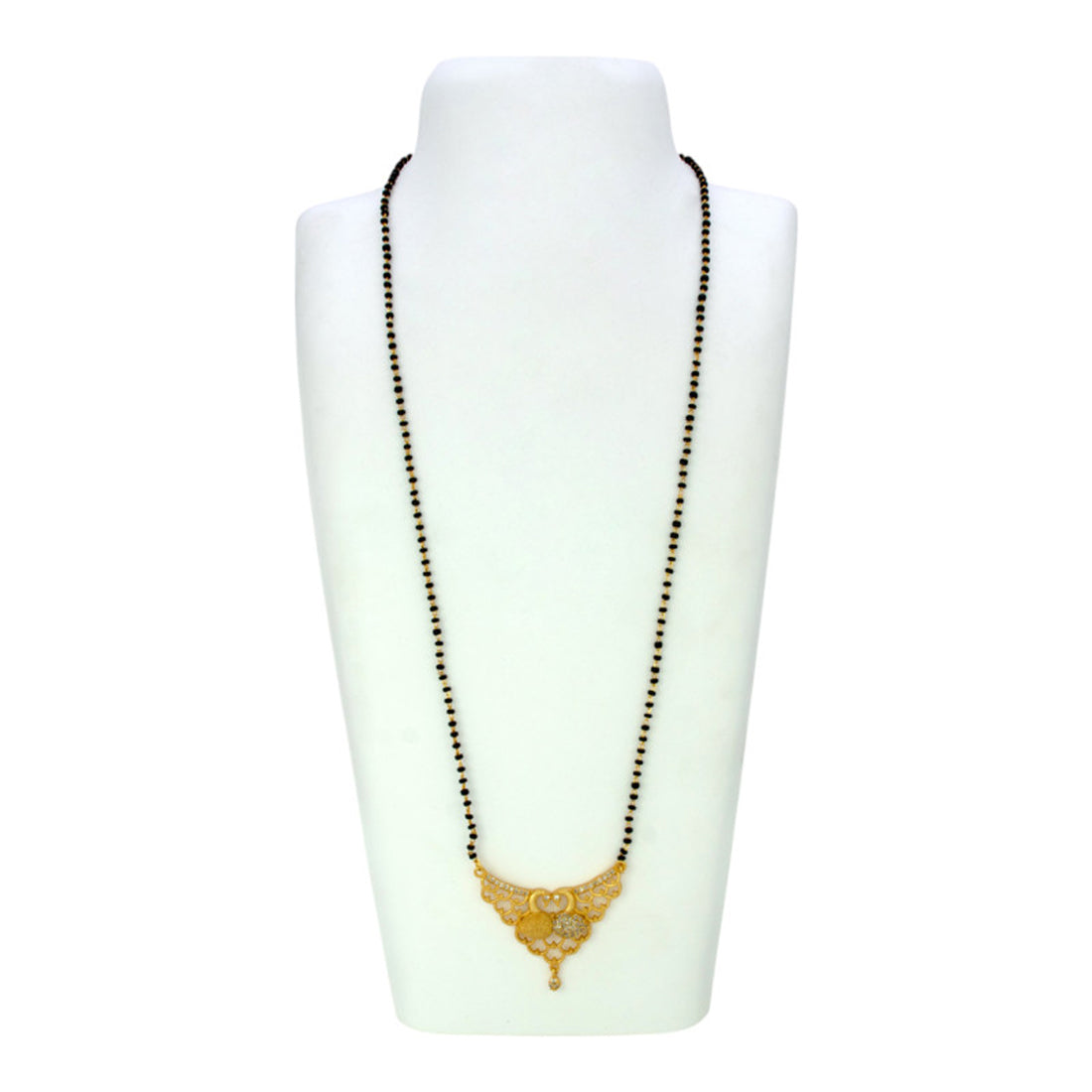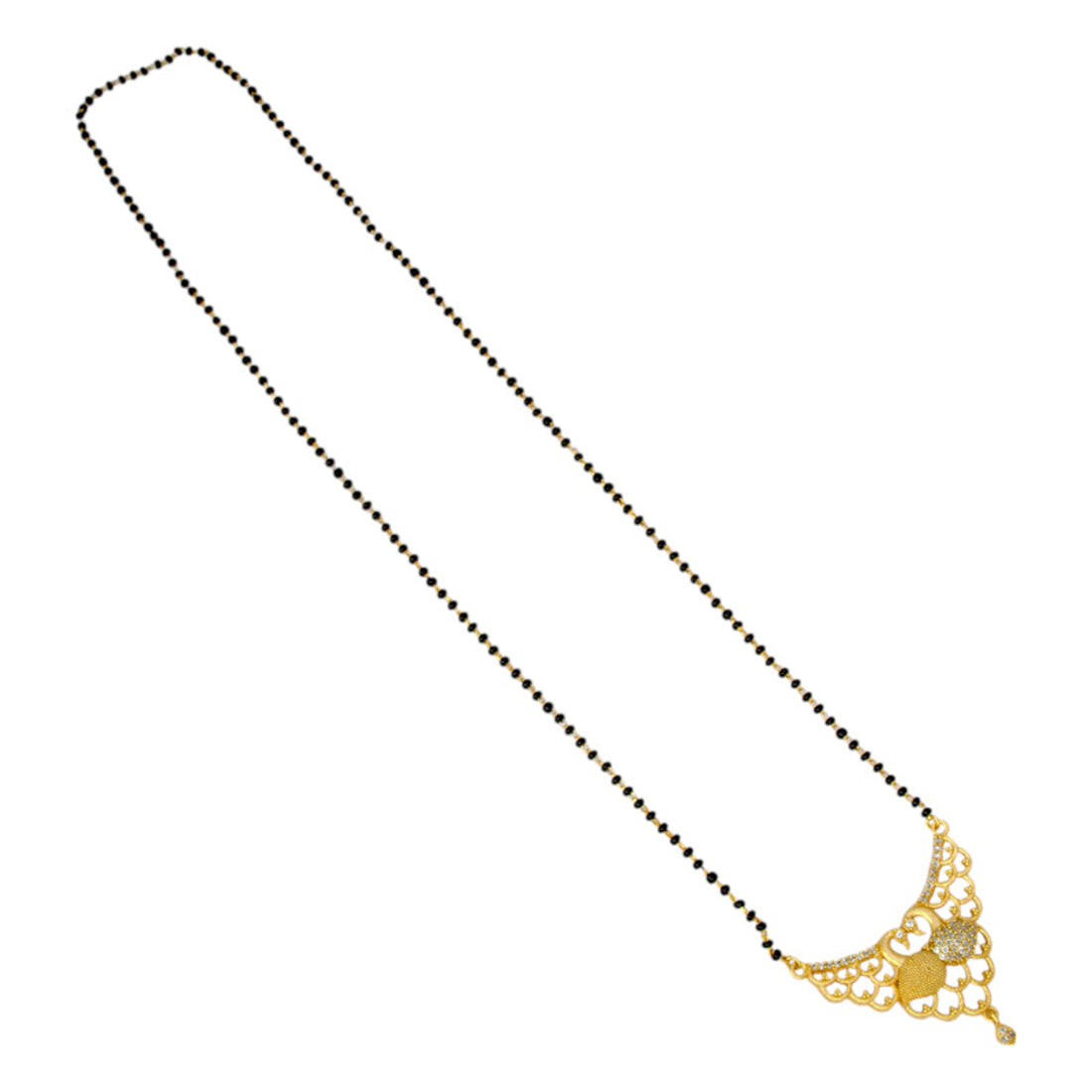 ഈ എലഗന്റ് ഗോൾഡ് പ്ലേറ്റഡ് സിസെഡ് ട്വിൻ പീക്കോക്ക് പെൻഡന്റ് മംഗൾസൂത്ര/കരിമണിമാല ഉപയോഗിച്ച് നിങ്ങളുടെ പരമ്പരാഗത വസ്ത്രശേഖരത്തിന് കാലാതീതമായ ചാരുത പകരൂ. തിളങ്ങുന്ന ക്യൂബിക് സിർക്കോണിയ കല്ലുകൾ കൊണ്ട് പൊതിഞ്ഞ മനോഹരമായി രൂപകൽപ്പന ചെയ്ത ഇരട്ട-മയിൽ ഡിസൈൻ ഈ അതിമനോഹരമായ പെൻഡന്റിൽ ഉൾക്കൊള്ളുന്നു. ഒരു ക്ലാസിക് കറുത്ത ബീഡ്ഡ് ചെയിനിൽ സജ്ജീകരിച്ചിരിക്കുന്ന ഈ കഷണം കൃപയും പാരമ്പര്യവും അനായാസമായി സംയോജിപ്പിച്ച് ദൈനംദിന ഭംഗിക്ക് അനുയോജ്യമാക്കുന്നു.