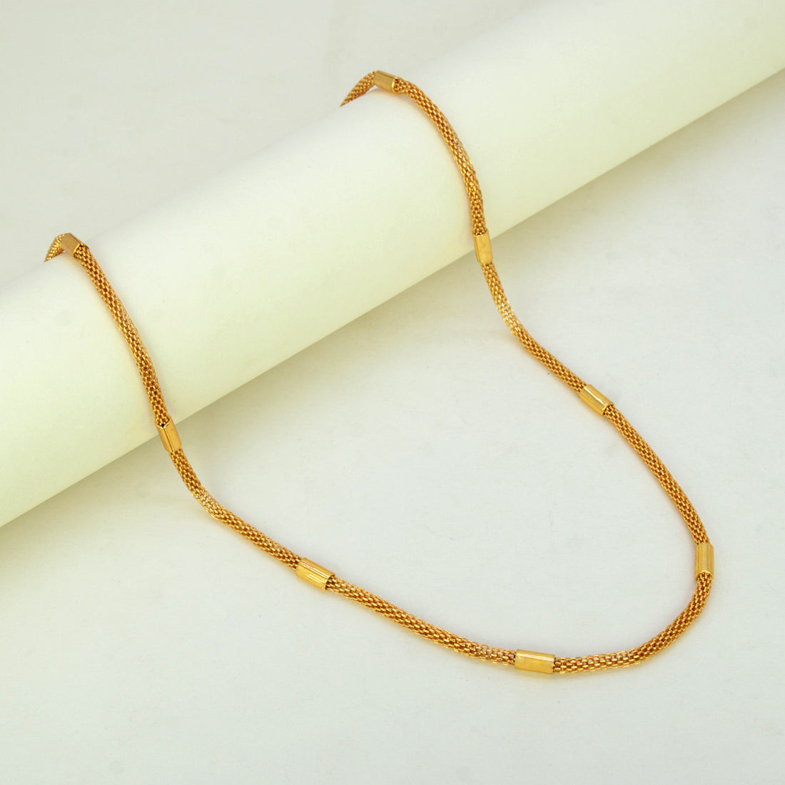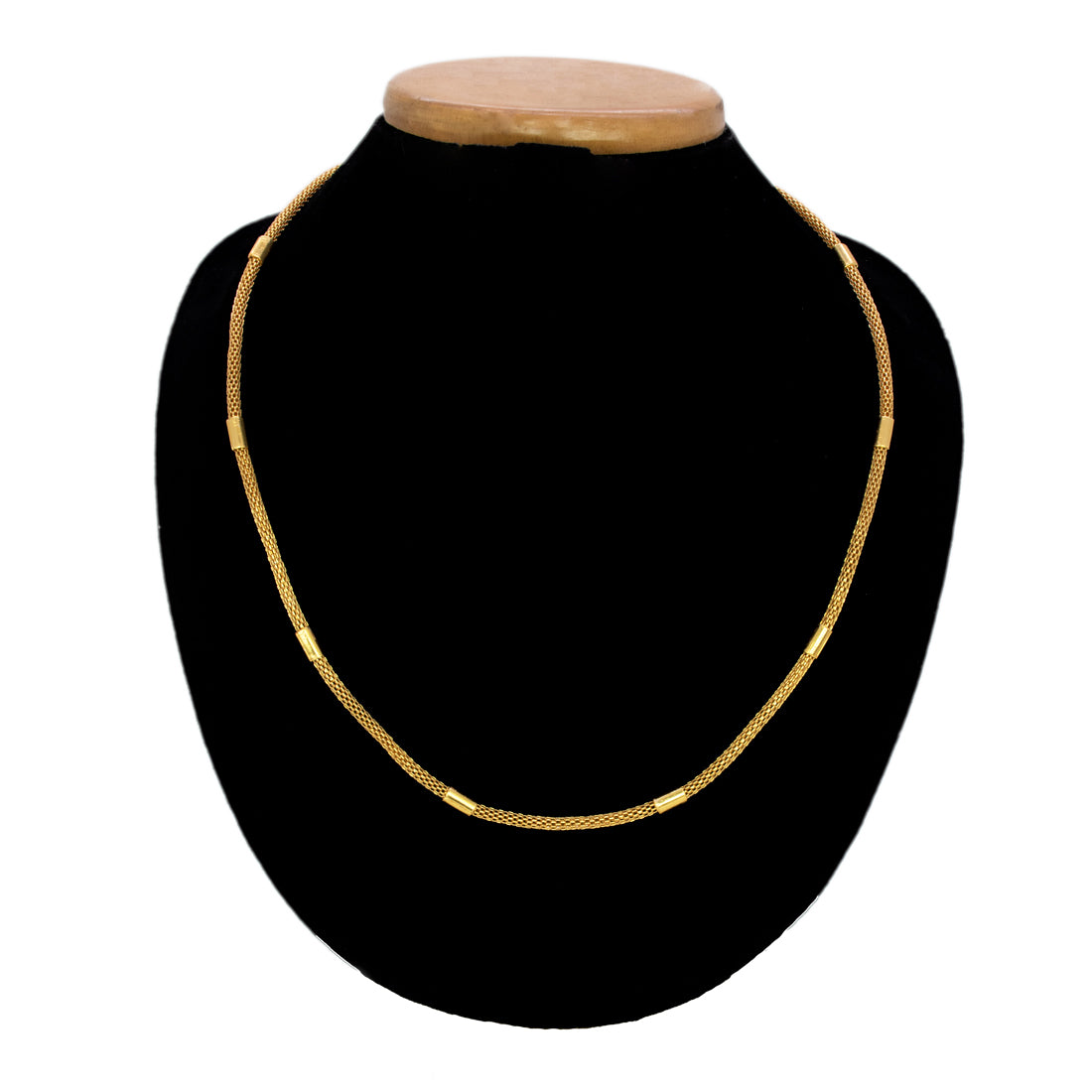 മനോഹരമായി രൂപകൽപ്പന ചെയ്ത ഈ എലഗന്റ് ഗോൾഡ് പ്ലേറ്റഡ് മെഷ് പൈപ്പ് ചെയിൻ ഉപയോഗിച്ച് നിങ്ങളുടെ സ്റ്റൈലിനെ ഉയർത്തുക. അതിലോലമായ മെഷ് പാറ്റേൺ ഉപയോഗിച്ച് രൂപകൽപ്പന ചെയ്ത് മിനുസമാർന്ന സിലിണ്ടർ വിശദാംശങ്ങൾ കൊണ്ട് അലങ്കരിച്ച ഈ ചെയിൻ ചാരുതയുടെയും ഈടിന്റെയും മികച്ച മിശ്രിതമാണ്. ഇതിന്റെ ഭാരം കുറഞ്ഞ ഡിസൈൻ ദൈനംദിന വസ്ത്രങ്ങൾക്ക് സുഖകരമാക്കുന്നു, അതേസമയം തിളക്കമുള്ള സ്വർണ്ണ പ്ലേറ്റിംഗ് സങ്കീർണ്ണതയുടെ ഒരു സ്പർശം നൽകുന്നു, ഇത് ഉത്സവ, പ്രത്യേക അവസരങ്ങൾക്ക് ഒരുപോലെ അനുയോജ്യമാക്കുന്നു. ഒരു ക്ലാസിക് ലുക്കിനായി ഇത് ഒറ്റയ്ക്ക് ധരിക്കുക അല്ലെങ്കിൽ കൂടുതൽ ആകർഷണീയതയ്ക്കായി നിങ്ങളുടെ പ്രിയപ്പെട്ട പെൻഡന്റുമായി ജോടിയാക്കുക.