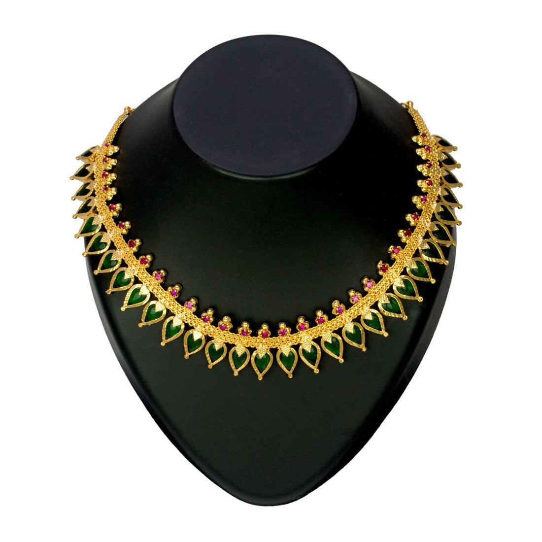 സ്ത്രീകൾക്കുള്ള എലഗന്റ് കേരള പരമ്പരാഗത ഗോപി ഡിസൈൻ നെക്ലേസ്. ഈ പ്രീമിയം സ്വർണ്ണം പൂശിയ പരമ്പരാഗത ആഭരണ ഡിസൈൻ കേരളത്തിന്റെ സമ്പന്നവും ചലനാത്മകവുമായ ആഭരണ സംസ്കാരത്തെ പ്രദർശിപ്പിക്കുന്നു. ക്രമീകരിക്കാവുന്ന ബാക്ക് ചെയിൻ ഉള്ള ഇത് സാരികളിലോ എത്നിക് വസ്ത്രങ്ങളിലോ ഒരു ക്ലാസിക് ടച്ച് നൽകുന്നു. ഈ ക്ലാസിക് ചോക്കർ സാധാരണയായി ദക്ഷിണേന്ത്യൻ വധുക്കളും സ്ത്രീകളും വിവാഹങ്ങളിലും ഉത്സവ അവസരങ്ങളിലും ധരിക്കുന്നു.