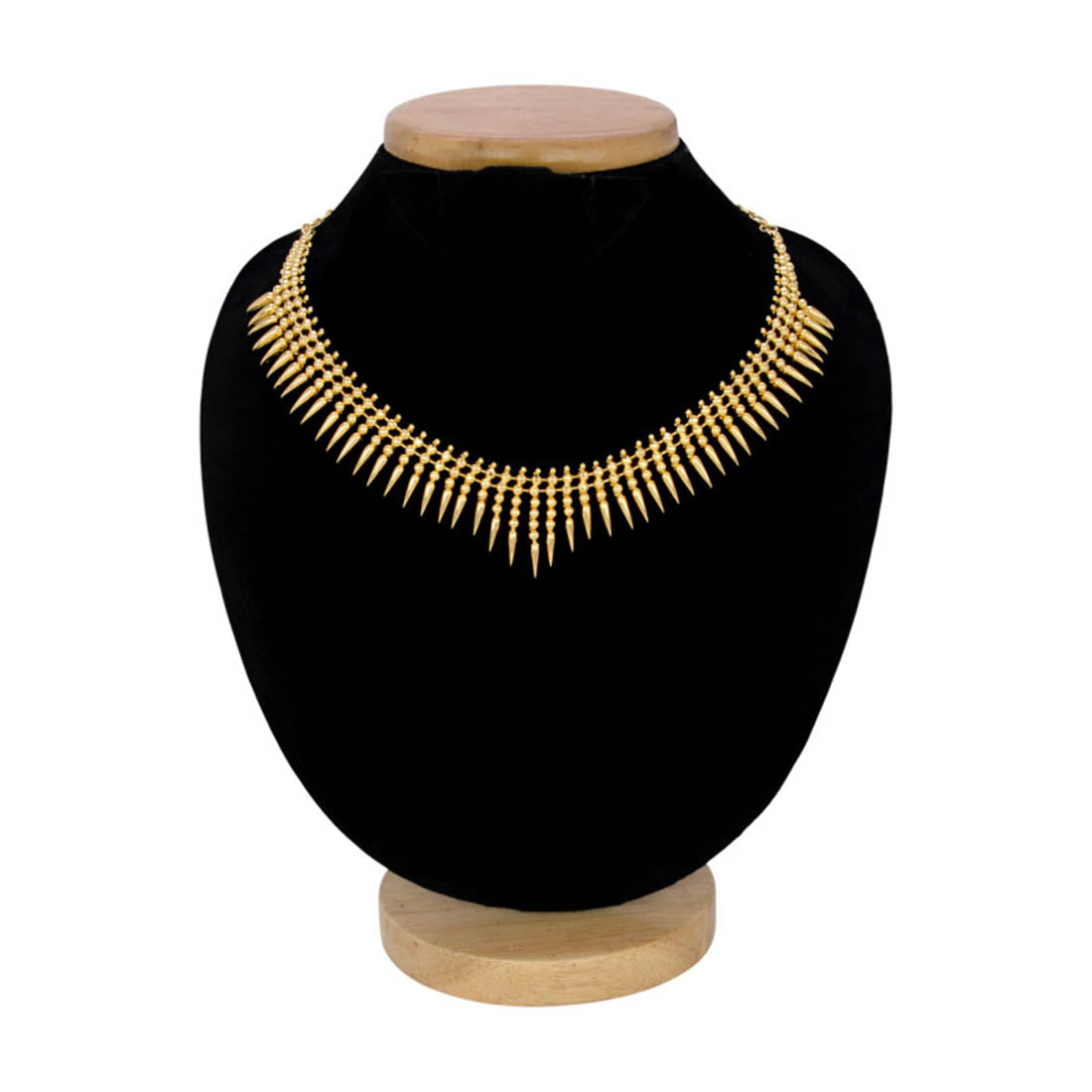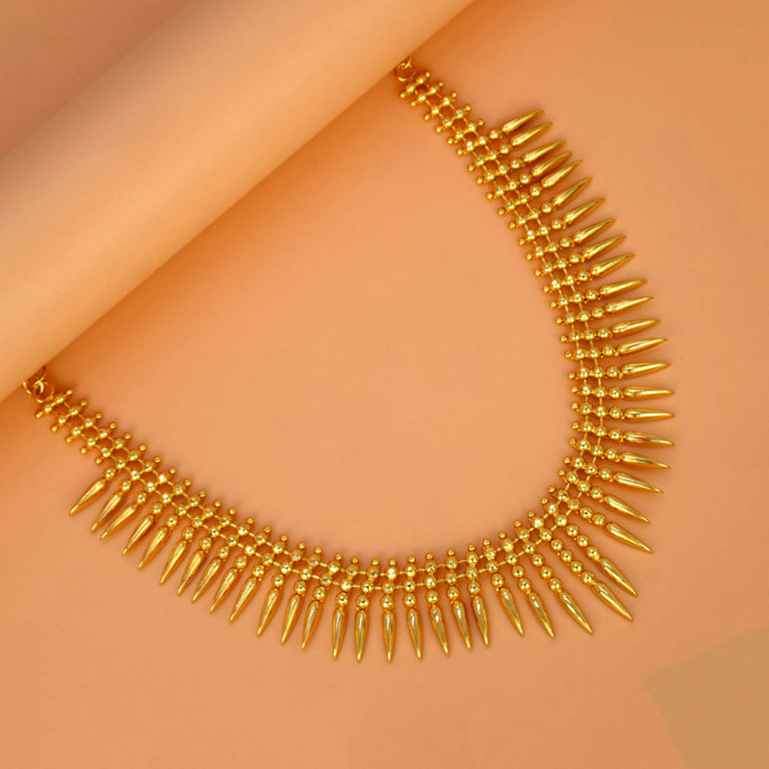 മനോഹരമായി രൂപകൽപ്പന ചെയ്ത മുല്ലമൊട്ട് (മുല്ലമൊട്ട്) മോട്ടിഫുകളുടെ തുടർച്ചയായ ശൃംഖല ഉൾക്കൊള്ളുന്ന അതിമനോഹരവും, സുന്ദരവും, പരമ്പരാഗതവുമായ സ്വർണ്ണം പൂശിയ ജാസ്മിൻ നെക്ലേസ്. ഈ കേരള പരമ്പരാഗത വധുവിന്റെ നെക്ലേസ് ഏത് വംശീയ വസ്ത്രത്തിനും അനുയോജ്യമാണ്, മാത്രമല്ല ഇത് സാധാരണയായി വധുക്കൾ അവരുടെ വിവാഹദിനത്തിൽ ധരിക്കുന്നു.