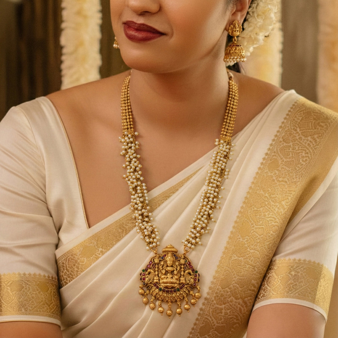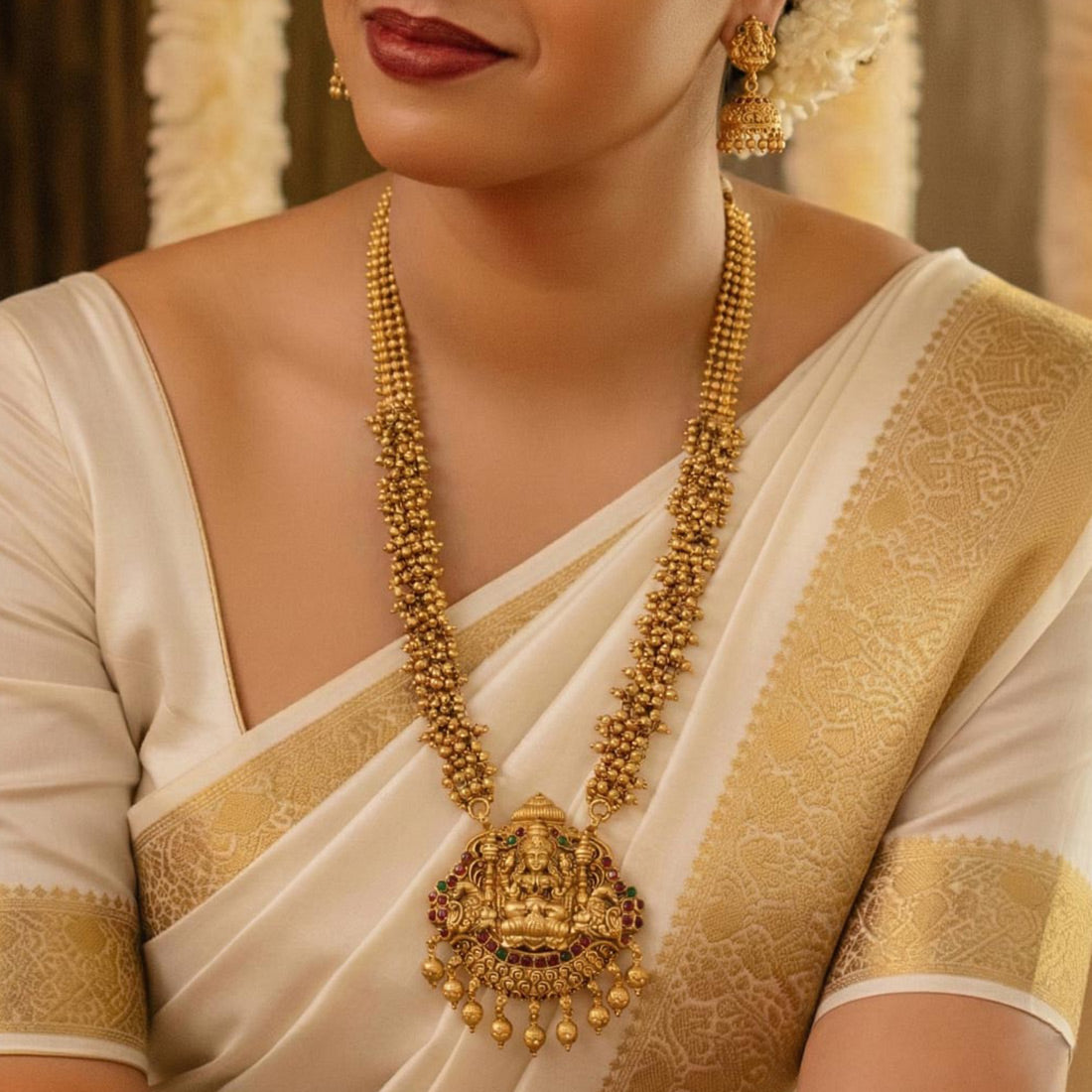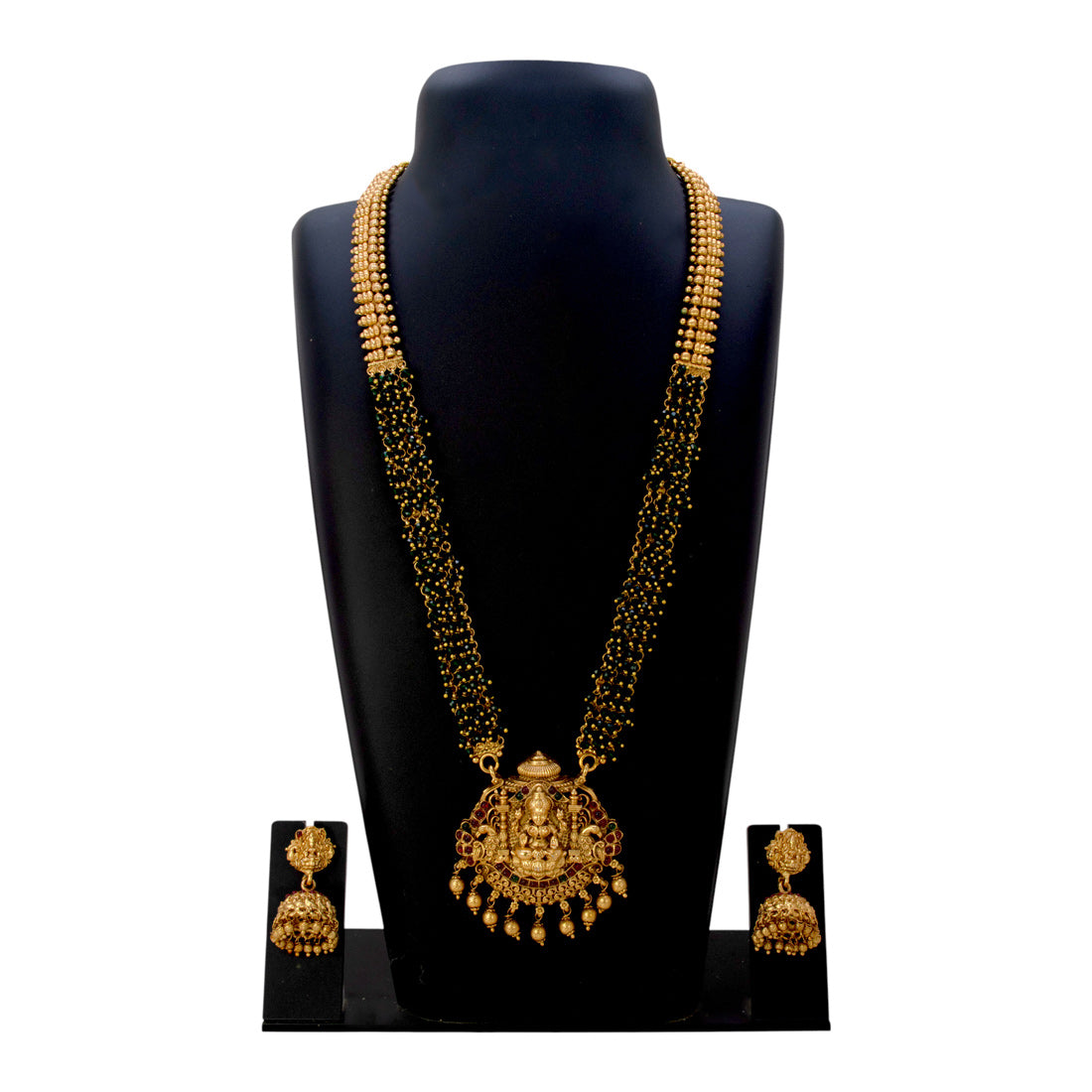 Celebrate traditional elegance with this Ethnic Antique Matte Lakshmi Temple Beaded Long Necklace Set. Crafted with an antique matte finish, the haram features an intricately detailed Goddess Lakshmi pendant that symbolises prosperity, wealth, and divine grace. The beautifully arranged beaded chain enhances the classic temple jewellery look, while the pendant is adorned with delicate hanging golden beads for an authentic antique appeal.