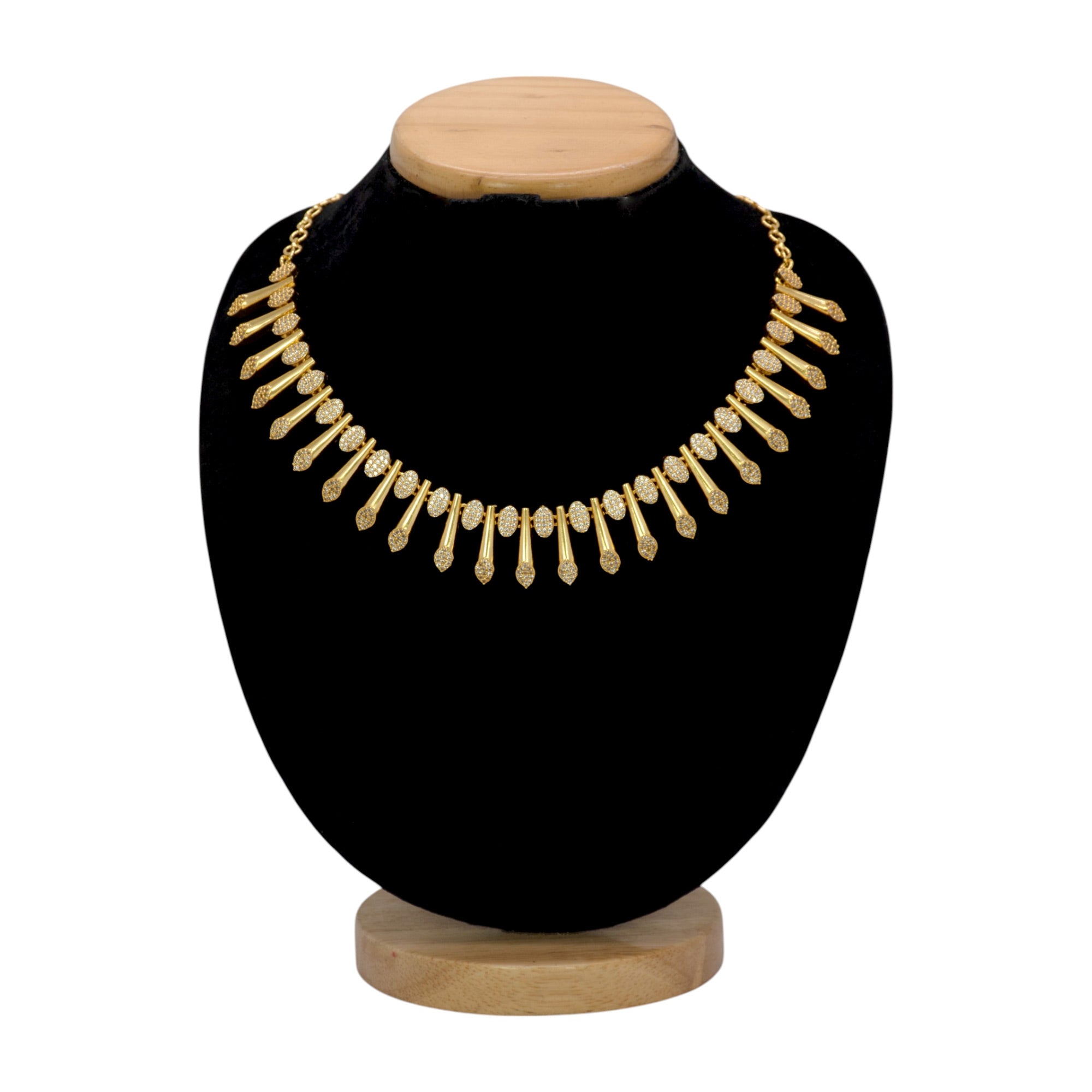 ഈ അതിമനോഹരമായ സ്വർണ്ണം പൂശിയ സ്പൈക്ക് ഡിസൈനർ സ്റ്റോൺ നെക്ലേസിൽ, ചാരുതയും സങ്കീർണ്ണതയും പ്രകടമാക്കുന്ന ഒരു പ്രീമിയം സ്വർണ്ണം പൂശിയ ഡിസൈൻ ഉൾപ്പെടുന്നു. ഇത് സെമി-പ്രഷ്യസ് കല്ലുകൾ കൊണ്ട് അലങ്കരിച്ചിരിക്കുന്നു, കരകൗശലവും വിശദാംശങ്ങളിലേക്കുള്ള ശ്രദ്ധയും എടുത്തുകാണിക്കുന്ന മനോഹരമായ പാറ്റേണിൽ സൂക്ഷ്മമായി ക്രമീകരിച്ചിരിക്കുന്നു.