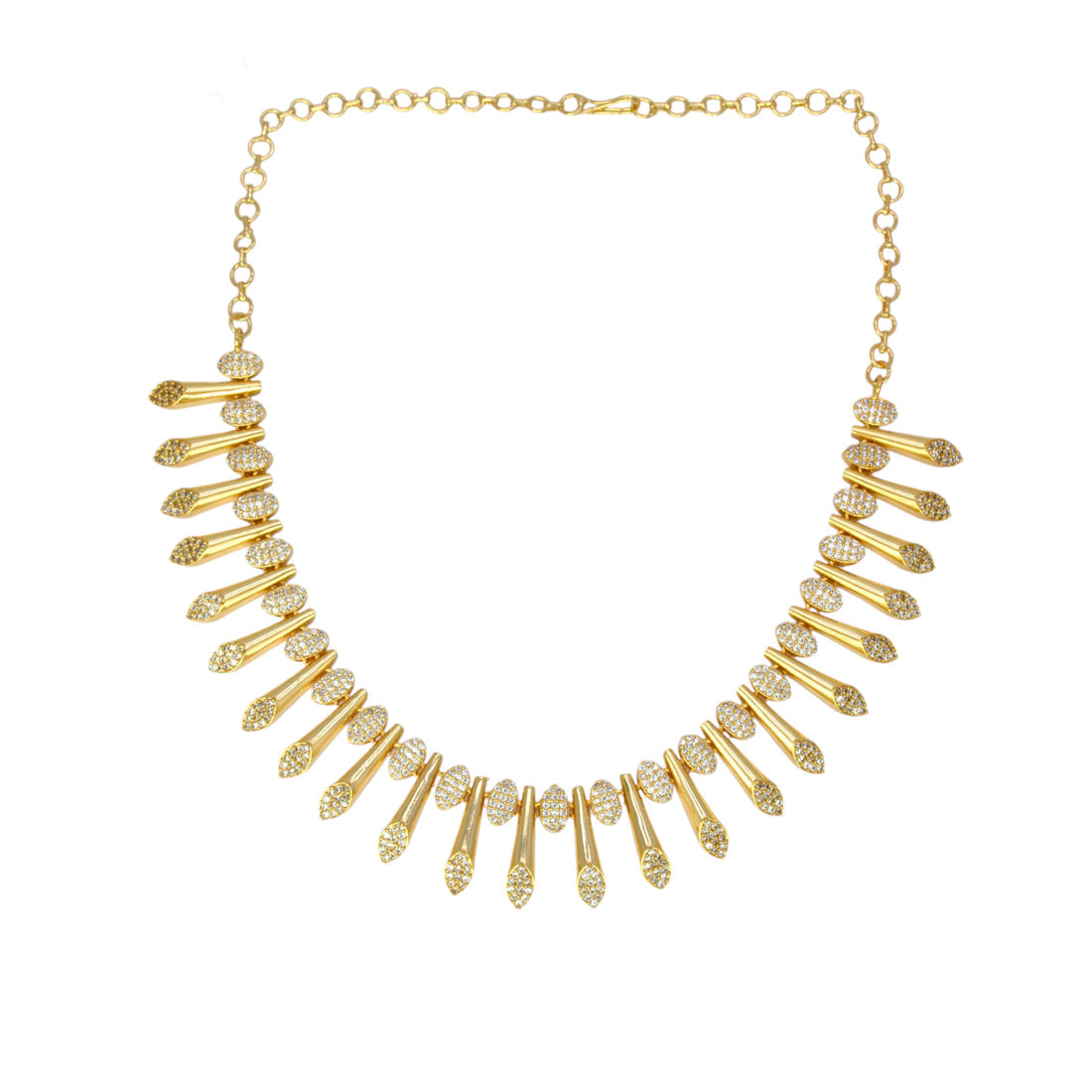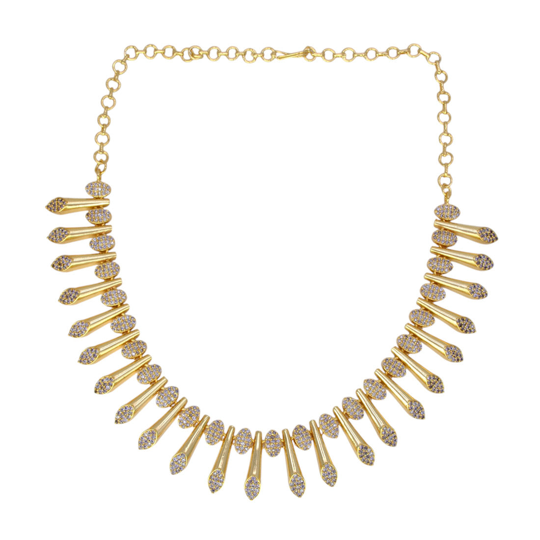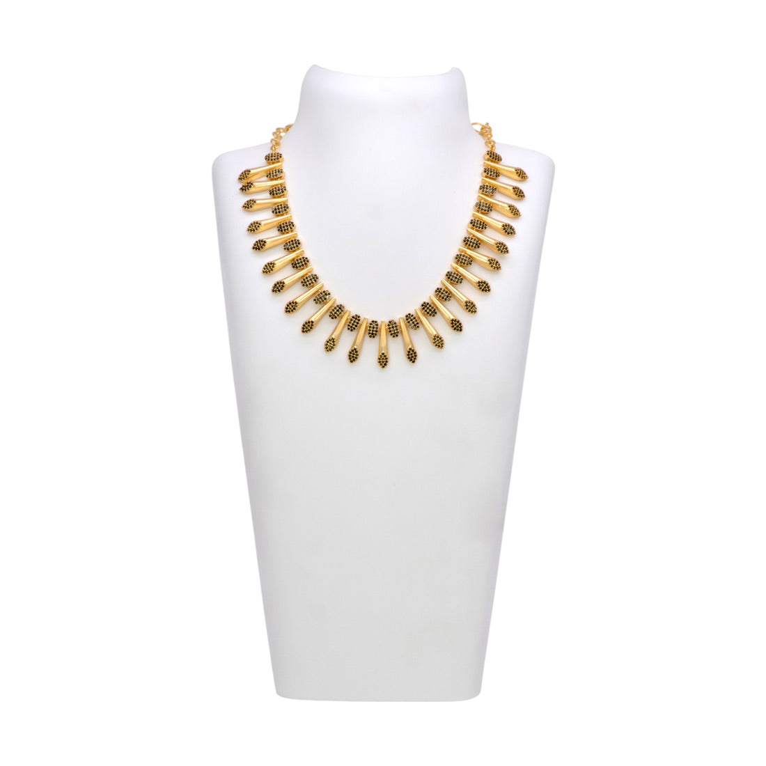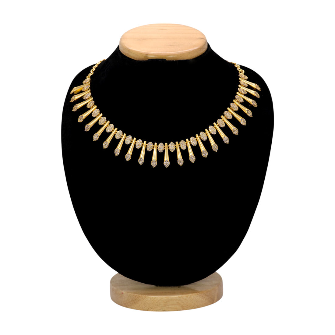 ഏതൊരു ആഭരണപ്പെട്ടിക്കും ഒരു അമൂല്യമായ കൂട്ടിച്ചേർക്കലായി മാറുന്ന ഈ വ്യതിരിക്തവും ആകർഷകവുമായ എക്സ്ക്വിസിറ്റ് ഗോൾഡ് പ്ലേറ്റഡ് സ്പൈക്ക് ഡിസൈനർ സ്റ്റോൺ നെക്ലേസ് ഉപയോഗിച്ച് നിങ്ങളുടെ ആഭരണങ്ങൾ മെച്ചപ്പെടുത്തുകയും പ്രേക്ഷകരെ ആകർഷിക്കുകയും ചെയ്യുക.