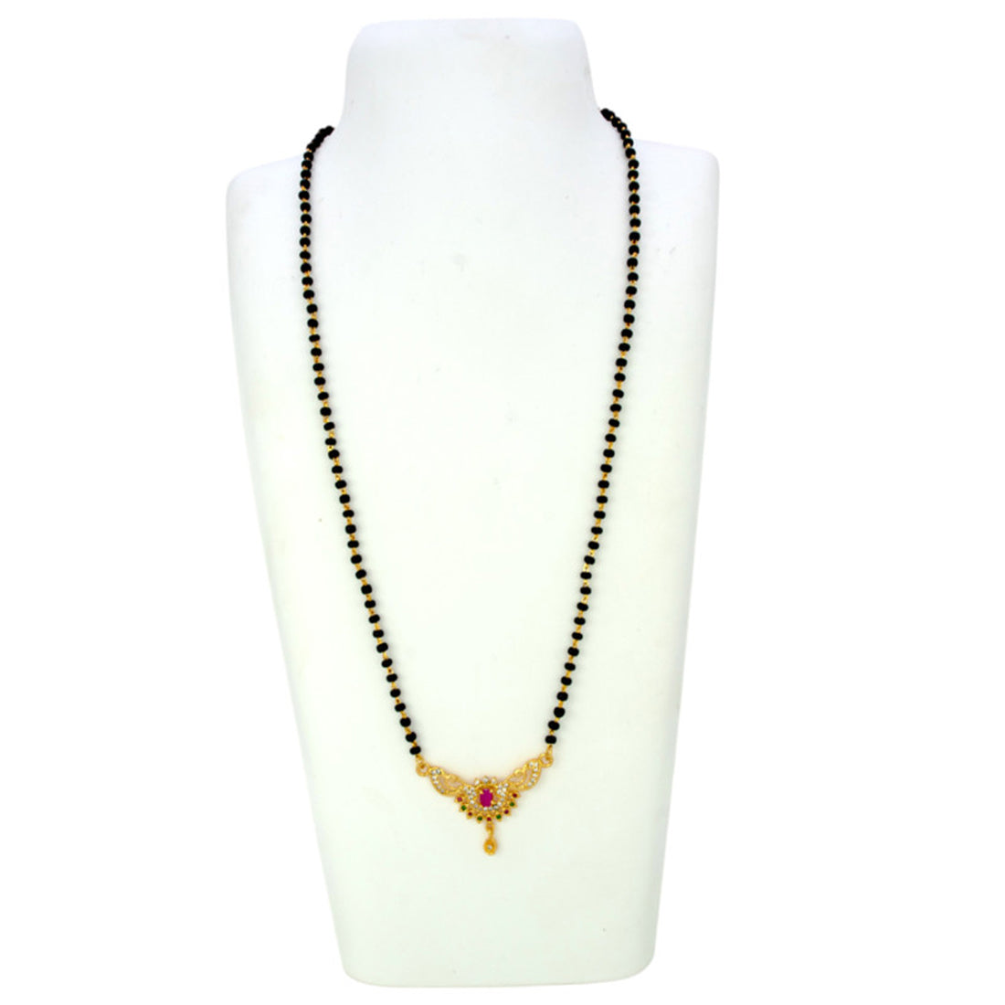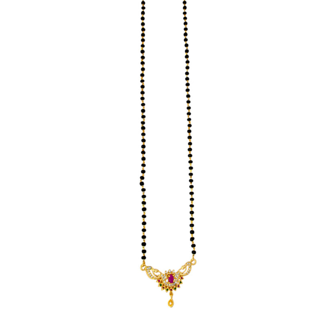 മനോഹരമായി രൂപകൽപ്പന ചെയ്ത മയിൽ പെൻഡന്റുള്ള, തിളങ്ങുന്ന CZ, റൂബി, മരതകം കല്ലുകൾ, റൂബി സ്റ്റോൺ സെന്റർപീസ് എന്നിവയാൽ ഹൈലൈറ്റ് ചെയ്ത, മനോഹരമായ സ്വർണ്ണ പൂശിയ കറുത്ത ബീഡ്സ് മയിൽ പെൻഡന്റ് മംഗലസൂത്ര. ദൈനംദിന വസ്ത്രങ്ങൾക്കോ ഉത്സവ അവസരങ്ങൾക്കോ ആകട്ടെ, ഇത് എല്ലാ വസ്ത്രങ്ങൾക്കും കാലാതീതമായ ഭംഗി നൽകുന്നു, കൂടാതെ സ്റ്റൈലുമായുള്ള സ്നേഹത്തിന്റെ പവിത്രമായ ബന്ധത്തെ അടയാളപ്പെടുത്തുന്നു.