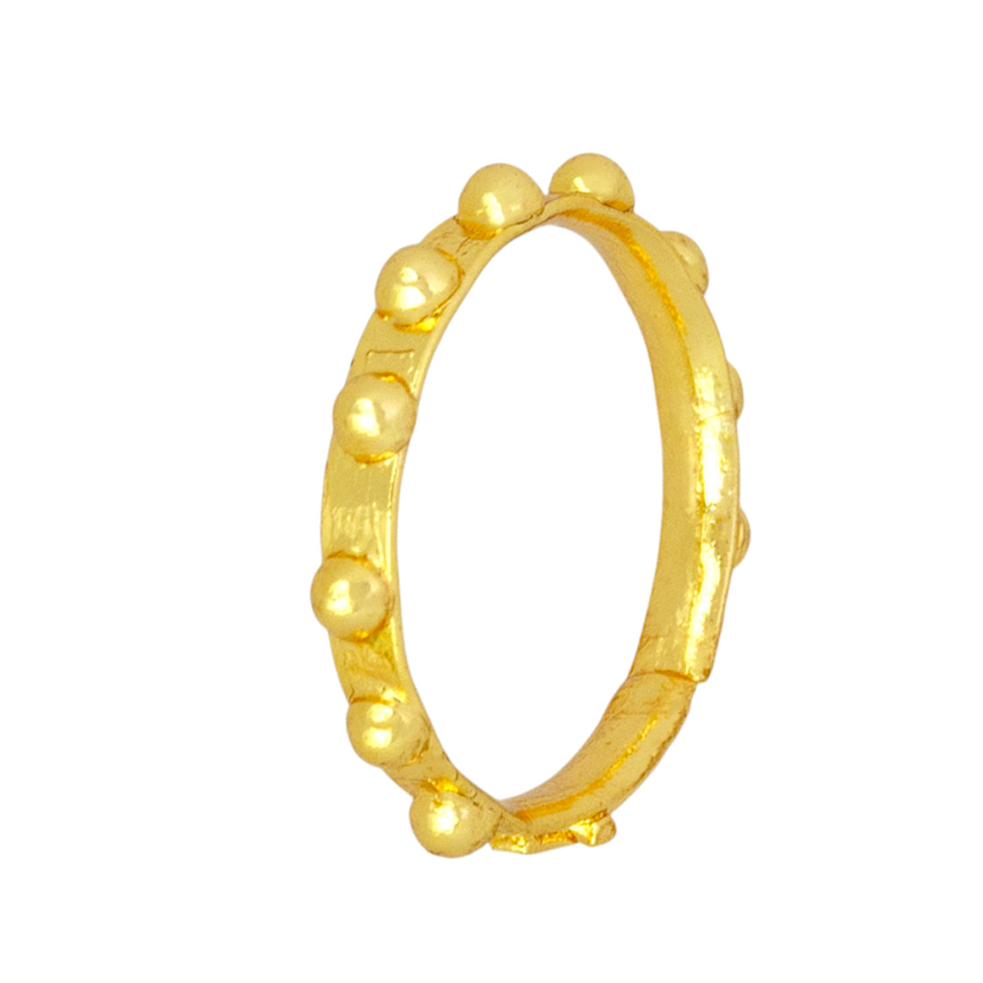 ഈ ഗോൾഡ് പ്ലേറ്റഡ് സിമ്പിൾ ബീഡഡ് ബാൻഡ് ഫിംഗർ മോതിരം ഉപയോഗിച്ച് അപ്രധാനമായ ഒരു ചാരുത സ്വീകരിക്കുക. അതിലോലമായ ബീഡുകളുടെ ഘടനയും സ്ലീക്ക് ഗോൾഡ്-പ്ലേറ്റ് ഫിനിഷും ഉപയോഗിച്ച് രൂപകൽപ്പന ചെയ്തിരിക്കുന്ന ഈ മോതിരം ലാളിത്യത്തിന്റെയും സ്റ്റൈലിന്റെയും തികഞ്ഞ മിശ്രിതമാണ്. ഒറ്റയ്ക്ക് ധരിച്ചാലും മറ്റ് മോതിരങ്ങൾക്കൊപ്പം ധരിച്ചാലും, ഇത് നിങ്ങളുടെ ദൈനംദിന ലുക്കിന് ഒരു മനോഹരമായ ആകർഷണം നൽകുന്നു.