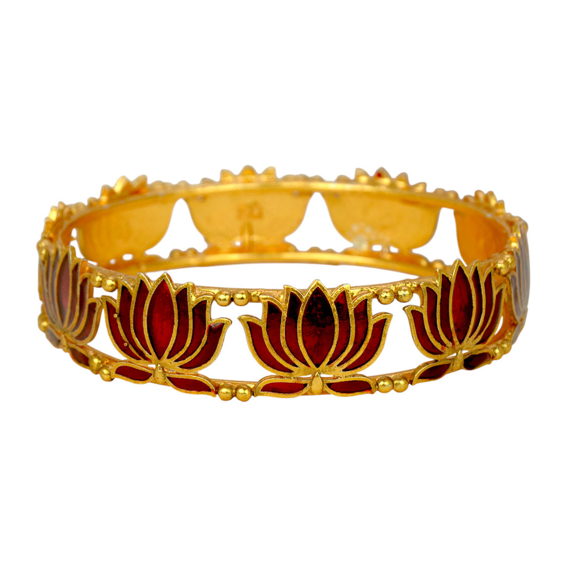 മാറ്റ് ഗോൾഡ് പ്ലേറ്റഡ് ലോട്ടസ് ഇനാമൽ വള, സങ്കീർണ്ണമായ താമര രൂപങ്ങൾ, സമ്പന്നമായ ഇനാമൽ വിശദാംശങ്ങൾ എന്നിവ ഉൾക്കൊള്ളുന്നു. കടും ചുവപ്പ്, കടും പച്ച, മൾട്ടികളർ വേരിയന്റുകളിൽ ലഭ്യമാണ്. ഉത്സവ, പരമ്പരാഗത അവസരങ്ങൾക്ക് അനുയോജ്യമാണ്. ഈ അതിമനോഹരമായ വസ്ത്രം പരമ്പരാഗത കേരള സാരികളെയും എത്നിക് വസ്ത്രങ്ങളെയും മനോഹരമായി പൂരകമാക്കുന്നു. പ്രത്യേക അവസരങ്ങൾക്കും സാംസ്കാരിക ആഘോഷങ്ങൾക്കും ഉത്സവ ഒത്തുചേരലുകൾക്കും അനുയോജ്യം.