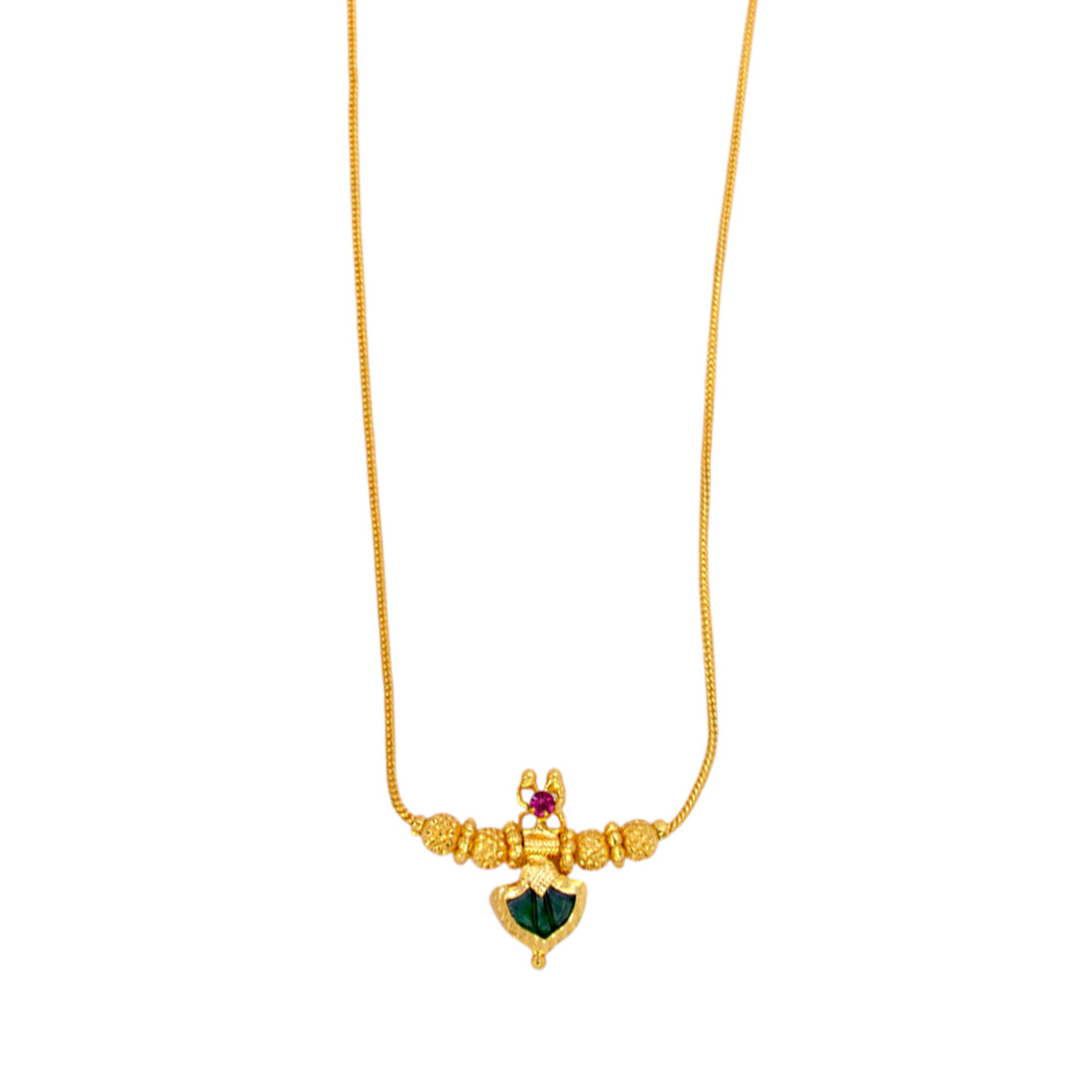 ലളിതമായ പരമ്പരാഗത സ്വർണ്ണ പൂശിയ ചെറിയ പാലക്ക പെൻഡന്റ് ചെയിൻ അതിശയകരമായ നീല, പച്ച നിറങ്ങളിൽ ലഭ്യമാണ്. ഈ പരമ്പരാഗത കേരള ശൈലിയിലുള്ള നെക്ലേസുകളിൽ സ്വർണ്ണ ഡിസൈനർ മുത്തുകൾ പതിച്ച നേർത്ത ചെയിനിൽ CZ/റൂബി കല്ലുകൾ കൊണ്ട് അലങ്കരിച്ച പാലക്ക പെൻഡന്റ് ഉണ്ട്. ദൈനംദിന വസ്ത്രങ്ങൾക്കും ഉത്സവ അവസരങ്ങൾക്കും സമ്മാനങ്ങൾക്കും അനുയോജ്യമായ ഈ കഷണങ്ങൾ പാരമ്പര്യത്തെ സൂക്ഷ്മമായ സങ്കീർണ്ണതയുമായി മനോഹരമായി സംയോജിപ്പിക്കുന്നു. നിങ്ങളുടെ വംശീയ വസ്ത്രധാരണത്തിന് യോജിച്ചതായി നിങ്ങളുടെ പ്രിയപ്പെട്ട നിറം തിരഞ്ഞെടുക്കുക.