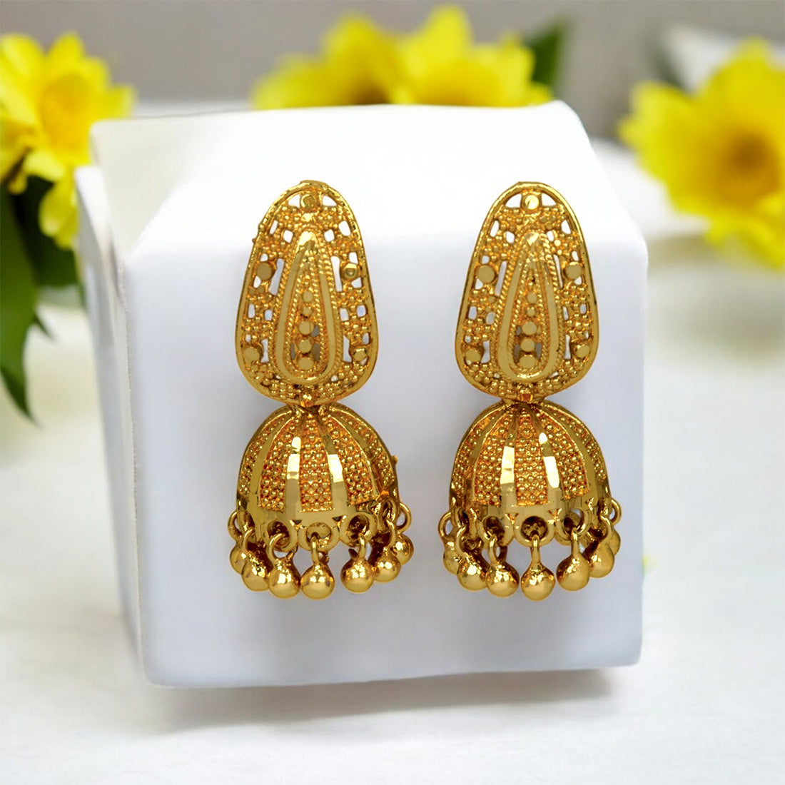 ഞങ്ങളുടെ ചെറിയ സ്വർണ്ണ പൂശിയ ഇല സ്റ്റഡ്സ് കുട ജുംകാസ് ഉപയോഗിച്ച് നിങ്ങളുടെ വാർഡ്രോബിന് ഒരു ഭംഗി പകരൂ . പരമ്പരാഗത ആകർഷണീയതയും ആധുനിക ആകർഷണീയതയും സംയോജിപ്പിച്ച്, ഏത് അവസരത്തിനും അനുയോജ്യമാക്കുന്ന ഈ അതിശയകരമായ കമ്മലുകൾ. ദൈനംദിന വസ്ത്രങ്ങൾക്കും പ്രത്യേക പരിപാടികൾക്കും അനുയോജ്യം.