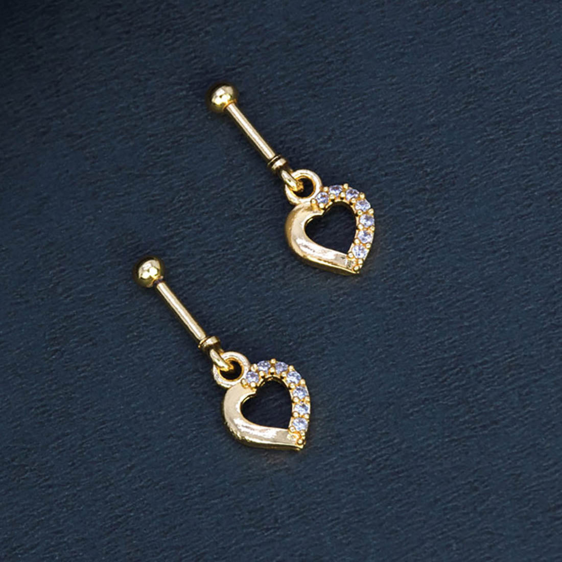 കൊല്ലം സുപ്രീം സ്റ്റൈലിഷ് ഗോൾഡ് പ്ലേറ്റഡ് സിസെഡ് ഹാർട്ട് ബുഗാഡി കമ്മലുകൾ ഉപയോഗിച്ച് നിങ്ങളുടെ പരമ്പരാഗത രൂപത്തിന് സ്നേഹത്തിന്റെയും തിളക്കത്തിന്റെയും ഒരു സ്പർശം നൽകുക. ആകർഷകമായ ഹൃദയാകൃതിയിൽ രൂപകൽപ്പന ചെയ്തിരിക്കുന്ന ഓരോ ജോഡിയും മനോഹരവും ട്രെൻഡിയുമായ ഫിനിഷിനായി സിസെഡ് കല്ലുകൾ കൊണ്ട് അലങ്കരിച്ചിരിക്കുന്നു. എത്നിക് അല്ലെങ്കിൽ മോഡേൺ വസ്ത്രങ്ങളുമായി ജോടിയാക്കാൻ അനുയോജ്യം, ഈ ബുഗാഡി കമ്മലുകൾ ഭാരം കുറഞ്ഞതും, സ്റ്റൈലിഷും, വൈവിധ്യപൂർണ്ണവുമാണ്.