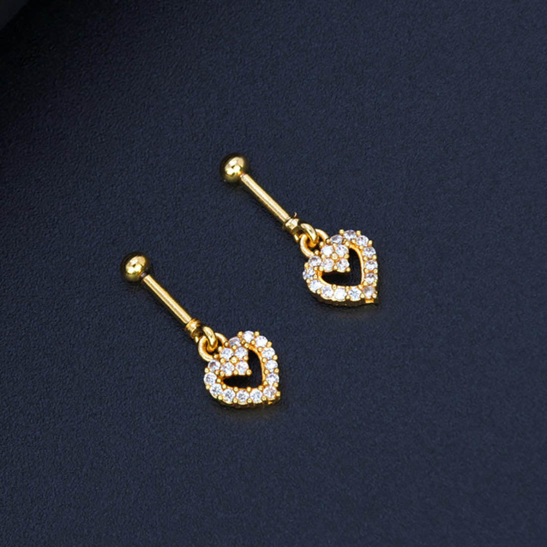 സ്ത്രീകൾക്കുള്ള സ്റ്റൈലിഷ് ഗോൾഡ് പ്ലേറ്റഡ് CZ ഹാർട്ട് ബുഗാഡി കമ്മലുകൾ. ക്യൂബിക് സിർക്കോണിയ കല്ലിൽ പതിച്ച ഹൃദയാകൃതികൾ, തൂക്കിയിട്ടിരിക്കുന്ന ബുഗാഡി കമ്മലുകൾ ഏത് അവസരത്തിനും ഭംഗിയും തിളക്കവും നൽകുന്നതിനായി രൂപകൽപ്പന ചെയ്തിരിക്കുന്നു. വ്യക്തിഗതമാക്കിയ സ്പർശനത്തിനായി ഹൃദയ ഡിസൈനുകളുള്ള ഒന്നിലധികം ശൈലികൾ വാഗ്ദാനം ചെയ്യുന്നു, അതിനാൽ ഓരോ വകഭേദവും നിങ്ങളുടെ അതുല്യമായ സംയോജനത്തെ മനോഹരമായി പൂരകമാക്കുന്നു.