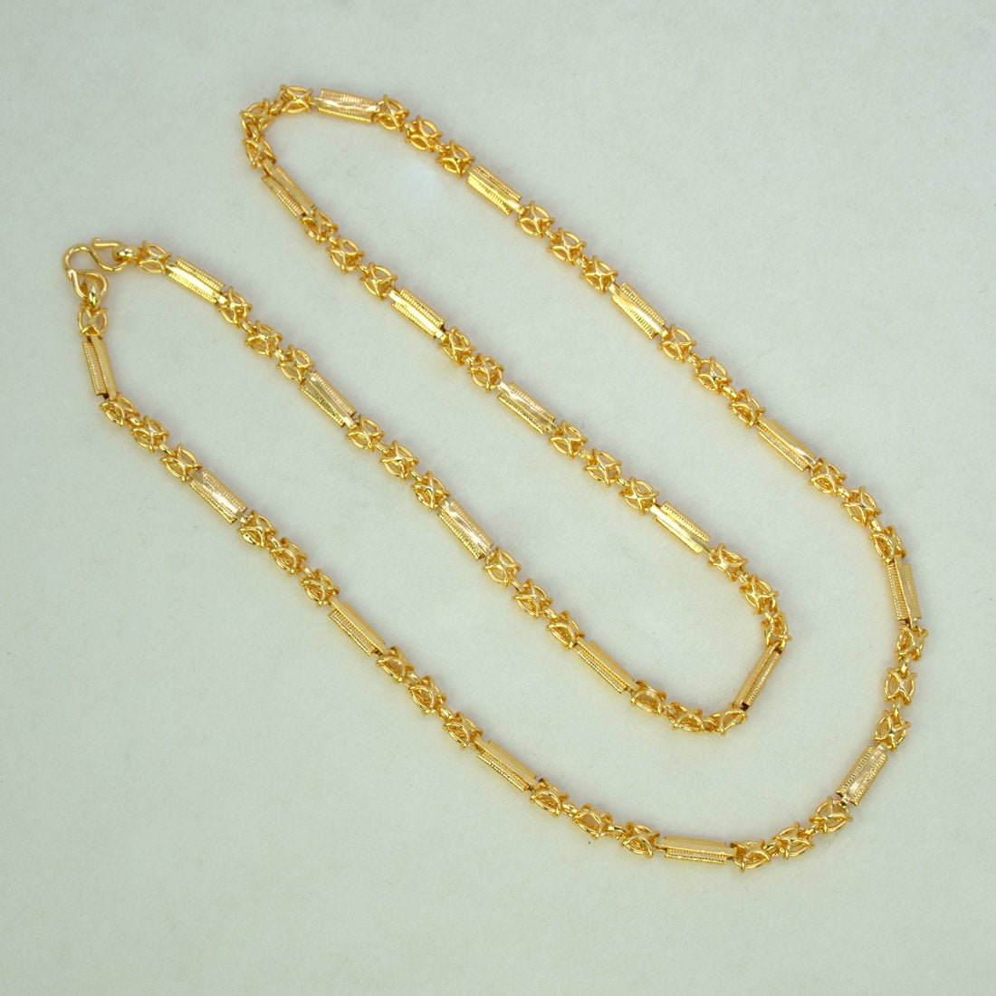 Elevate your everyday and festive looks with this Stylish Gold Plated Designer Unisex Chain. Crafted with a unique combination of polished cylindrical links and elegant floral-inspired connectors, this chain offers a rich gold finish that resembles real gold jewellery. Its lightweight yet sturdy design ensures comfortable wear throughout the day, making it perfect for daily use, office wear, or special occasions. Style it solo for a classy statement or layer it with other chains for a trendy look.