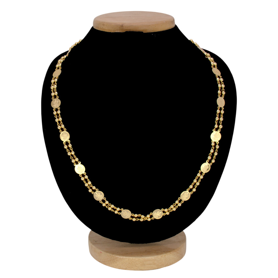 സ്ത്രീകൾക്കായി പരമ്പരാഗത നാണയം/കാശു, മണിമാല എന്നിവയുടെ സംയോജനമായ ട്രെൻഡി സ്വർണ്ണം പൂശിയ ഇരട്ട പാളി ചെയിൻ. ഈ എത്നിക് ചെയിൻ ഉപയോഗിച്ച് പൈതൃകത്തിലും സങ്കീർണ്ണതയിലും അലങ്കാരം നേടൂ. വിവാഹ ചടങ്ങുകളിലോ ക്ഷേത്രങ്ങളിലോ സാരിയോടോ പരമ്പരാഗത വസ്ത്രങ്ങളോ ഉപയോഗിച്ച് ഇത് ധരിക്കൂ..