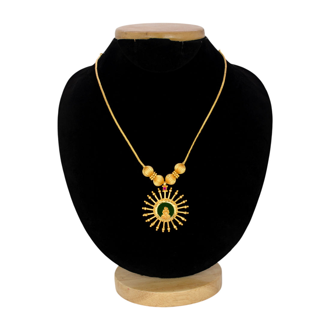 വൃത്താകൃതിയിലുള്ള, തിളക്കമുള്ള സൂര്യപ്രകാശ പെൻഡന്റ് ഉള്ള പരമ്പരാഗത സ്വർണ്ണം പൂശിയ ലക്ഷ്മി പെൻഡന്റ് നെക്ലേസ്. മധ്യഭാഗത്ത് കടും പച്ച നിറത്തിലുള്ള പാലക്ക ശൈലിയിലുള്ള അടിത്തറയുണ്ട്, അതിൽ കൊത്തിയെടുത്ത ലക്ഷ്മി മോട്ടിഫ്, റൂബി കല്ല് കൊണ്ട് അലങ്കരിച്ചിരിക്കുന്നു. സാംസ്കാരിക ചടങ്ങുകൾ, ഉത്സവങ്ങൾ മുതലായവയ്ക്ക് അനുയോജ്യം.