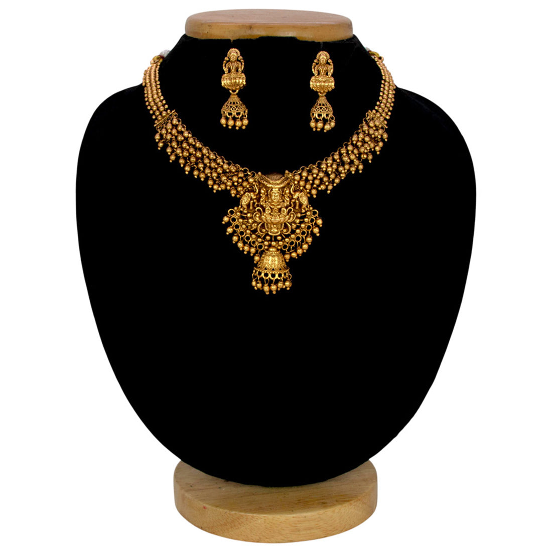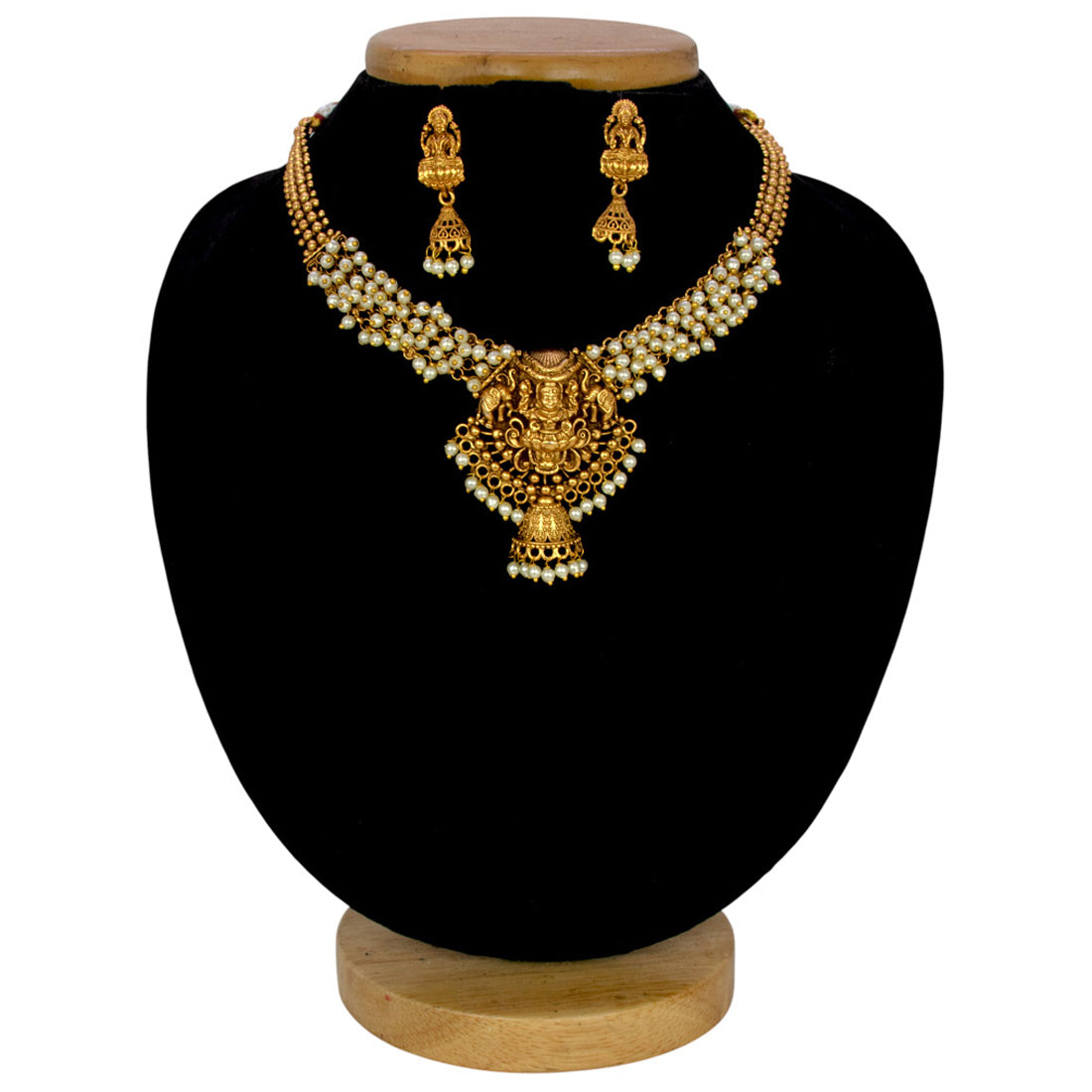 Traditional Antique Gold Plated Lakshmi Gunghroo Necklace Set for women featuring a Lakshmi temple pendant and matching jhumka earrings. Perfect for weddings, festivals, and traditional occasions with sarees or ethnic outfits. Available in two variants - Pearls and Golden beads.