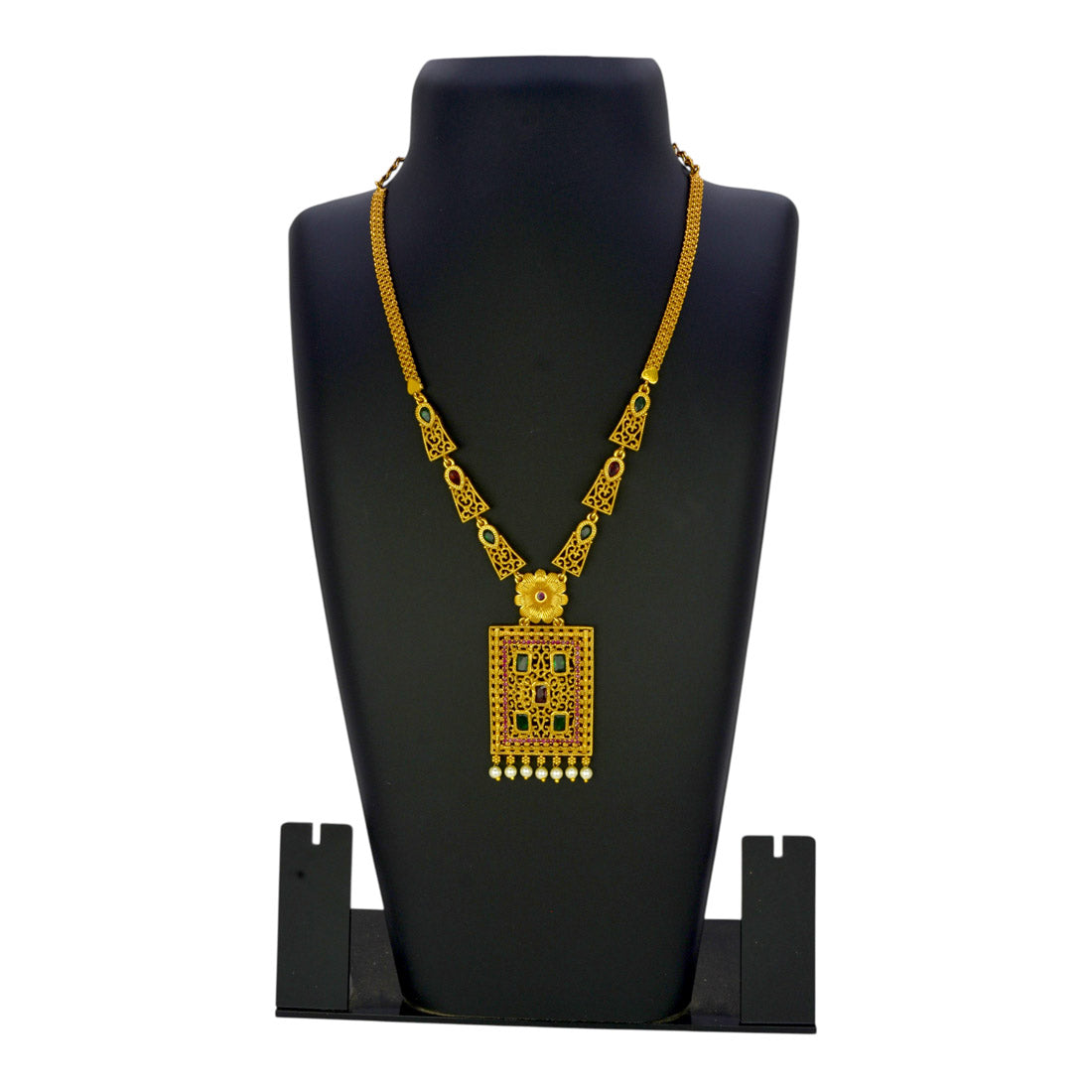 Elegant Antique Ruby Emerald Victorian Long Necklace featuring a beautifully carved rectangular pendant adorned with ruby and emerald stones. The intricate floral and filigree detailing adds a royal touch, making it perfect for festive and traditional occasions.