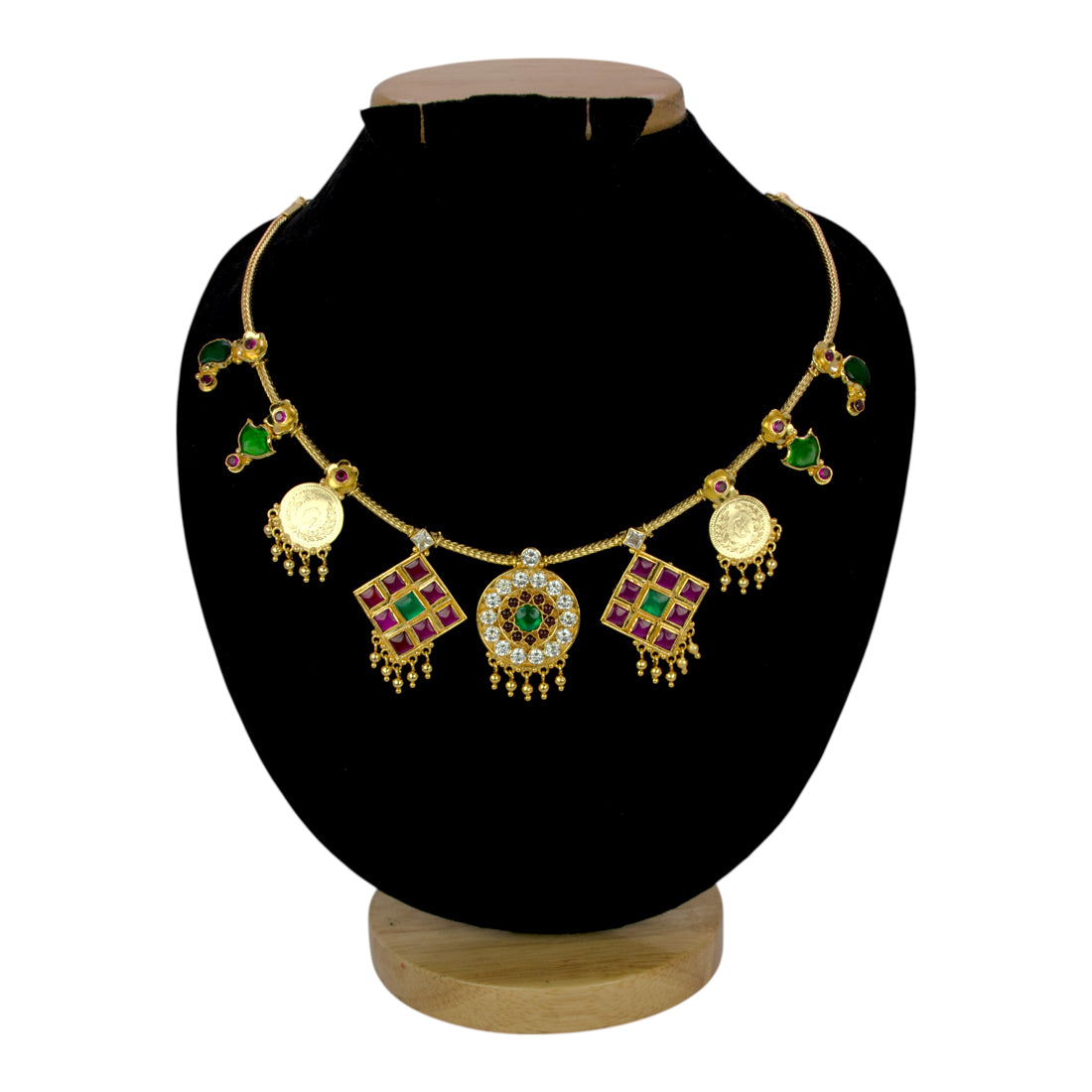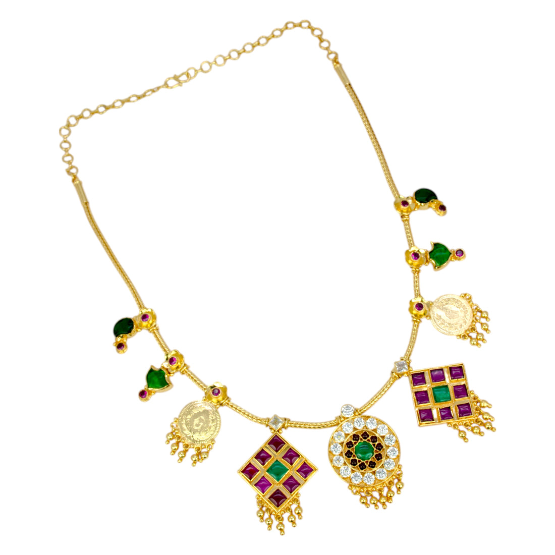 Elevate your elegance with this exquisite Enchanting Heritage Gold Plated Pendants Necklace, masterfully crafted to blend tradition and modernity. This unique piece features a delicate smooth gold plated chain adorned with vibrant floral mango and palakka motifs in rich green enamel. The Arya necklace is further embellished with a captivating array of coin and square pendants, each a work of art.