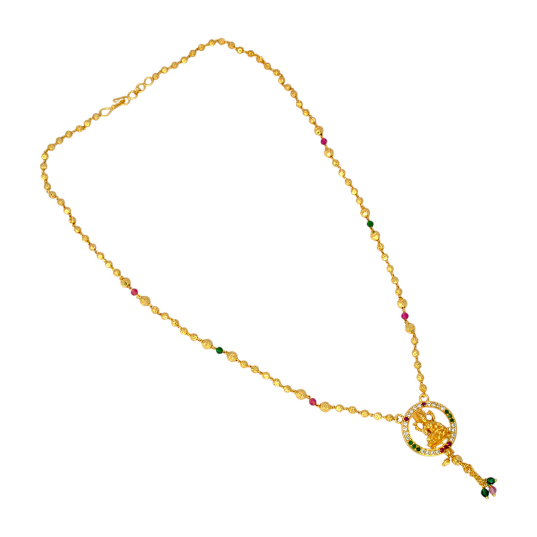 Add a touch of tradition and elegance with this Ethnic Gold Plated Ball Chain Halo Lakshmi Pendant Necklace. The pendant showcases Goddess Lakshmi within a halo design having Ruby, Emerald and CZ stones, symbolising prosperity and blessings.