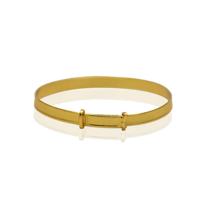 Adjustable Gold Plated Rail Baby Bangles crafted for infants and toddlers up to age 3, these pieces blend timeless elegance with contemporary style. The durable gold plating ensures a lustrous finish that complements both traditional and modern wardrobes, making them equally suited for baby girls and boys. Lightweight and comfortable for delicate skin, these bangles are an ideal choice for everyday wear, special occasions, or meaningful gifts. Each piece is designed to withstand the active lifestyle of young children while maintaining its radiant appearance.