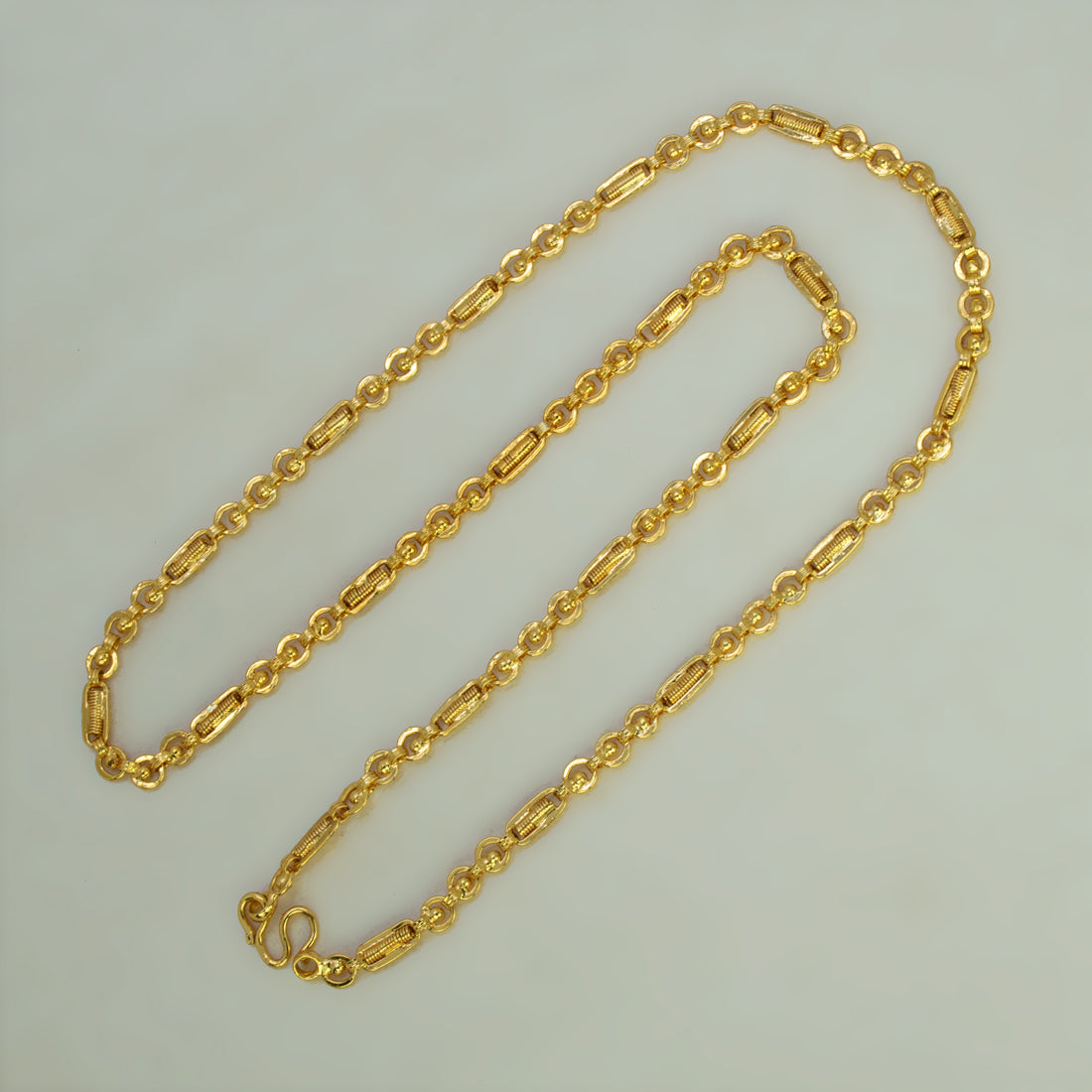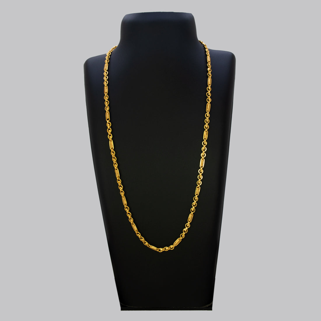 The Gold Plated Designer Kaveri Chain combines contemporary style with versatile wear. This 24-inch micro gold-plated chain offers a lightweight option suitable for both everyday elegance and special occasions. The sophisticated design appeals to women and teenagers seeking a timeless piece that transitions seamlessly from casual to formal settings. An ideal addition to any jewellery collection.