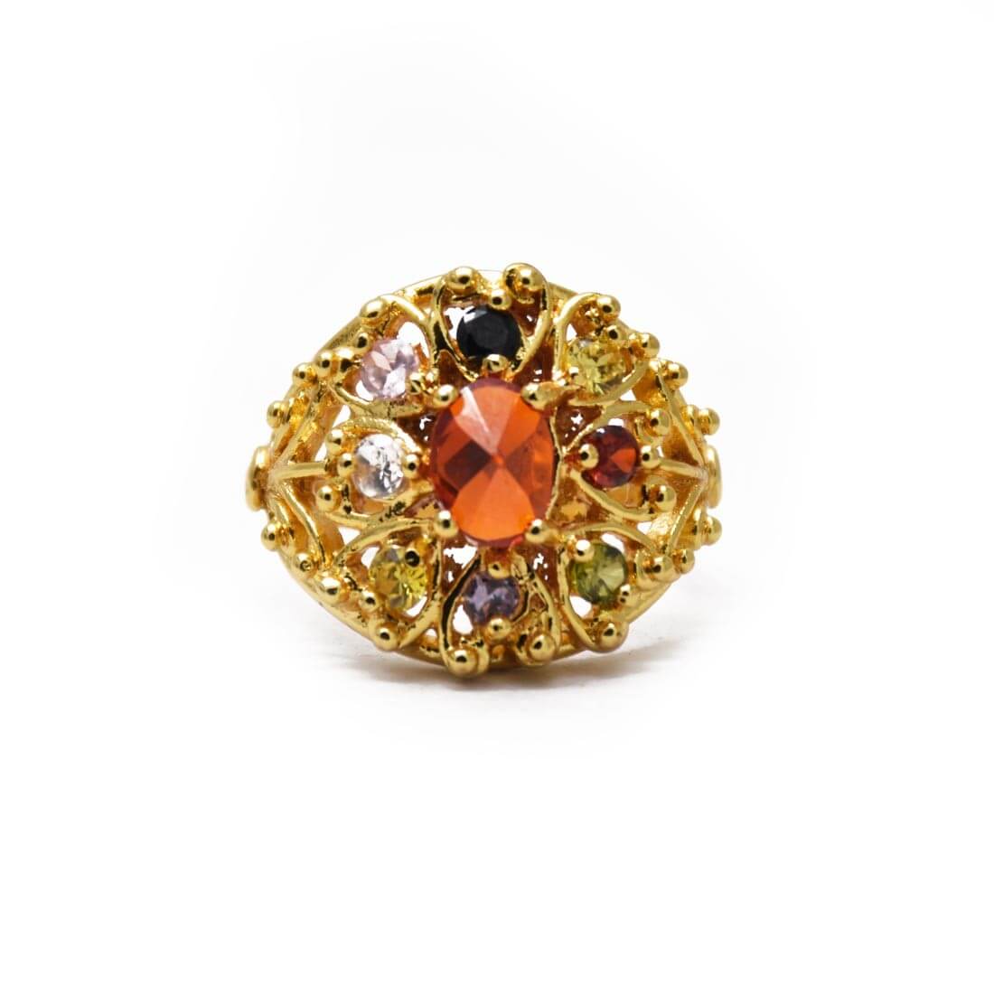 Embrace timeless elegance with this Men's Premium Gold Plated Navaratna Model Finger Ring, a sophisticated tribute to ancient astrological tradition. Featuring all nine planetary gemstones in one striking design, this piece combines aesthetic appeal with cultural significance. The gold plating adds a grand finish, while the synthetic stones deliver brilliant sparkle and durability for everyday wear. Whether you're drawn to the symbolic meaning of Navratna gems or simply appreciate fine craftsmanship, this ring makes a distinguished statement. Perfect for those seeking a blend of heritage and contemporary style.