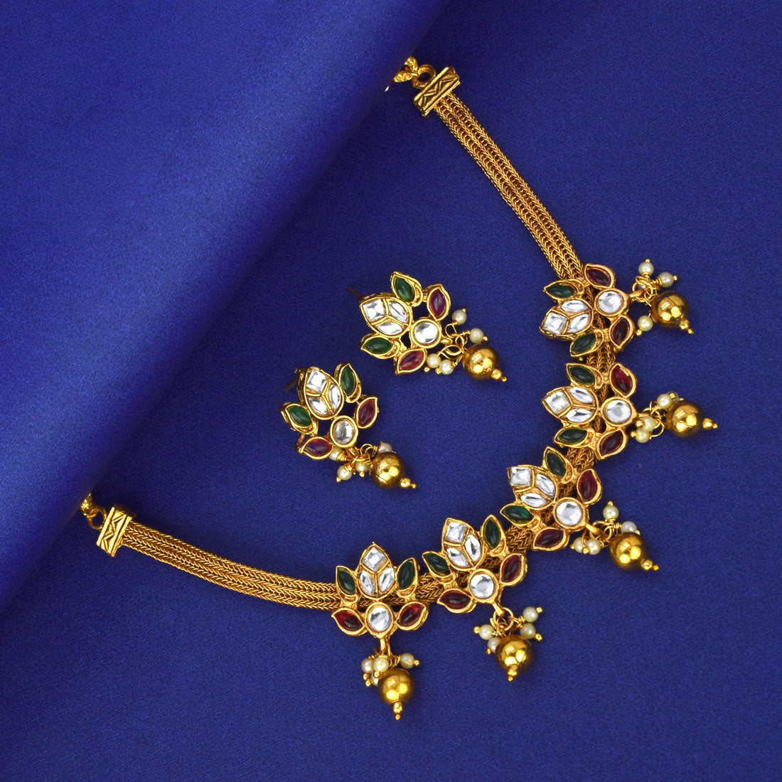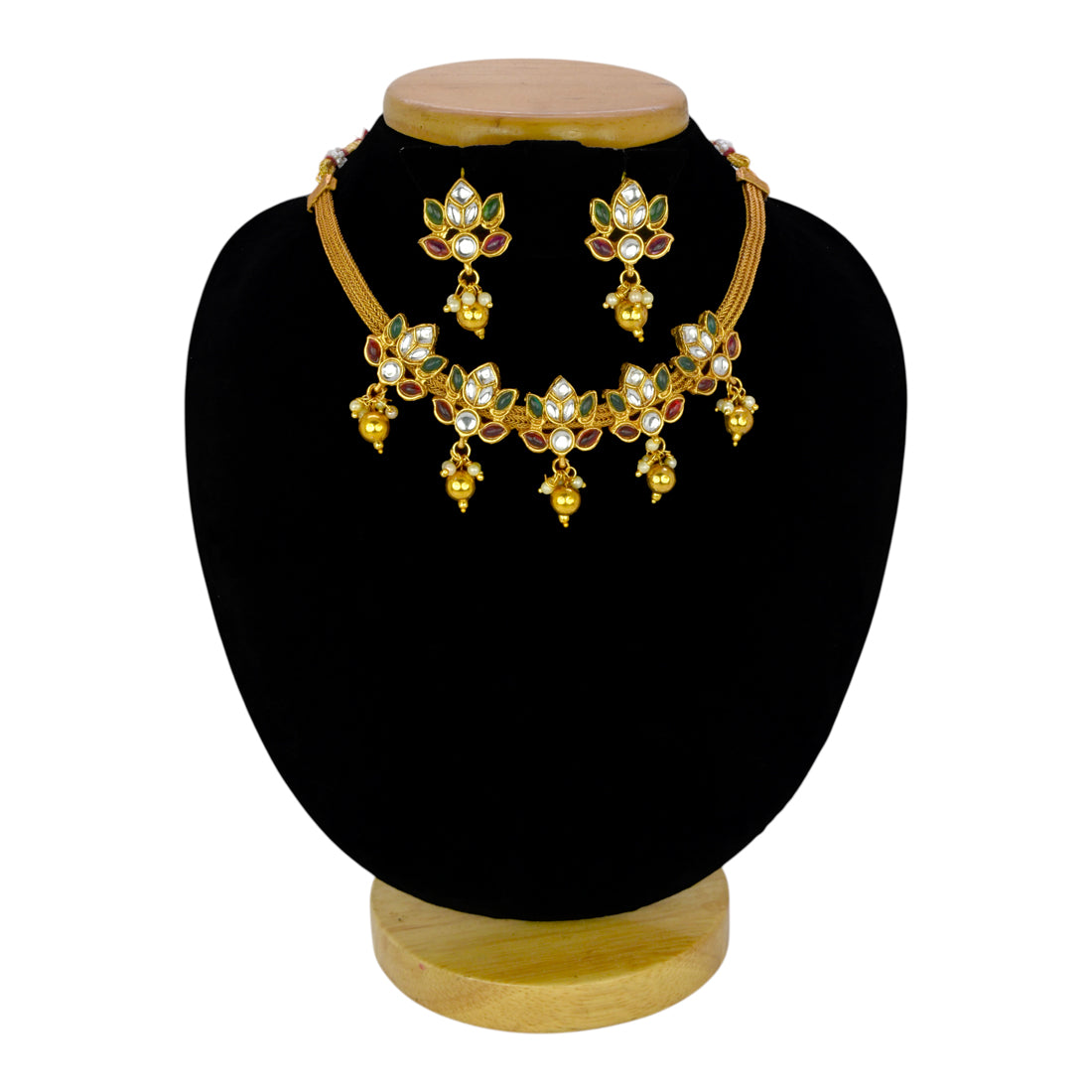 Celebrate tradition with this exquisite Multi-colour Kemp Stone Matte Lotus Necklace Set. Designed with a stunning lotus motif, the necklace is adorned with classic red and green Kemp and white kundan-like stones, highlighted by glossy golden beads that add richness and charm. The jewellery set is completed with a pair of matching earrings, perfectly complementing the necklace for a graceful finish.