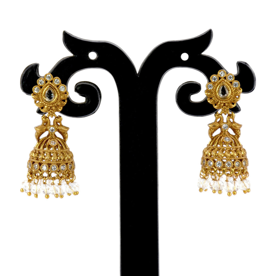 Small Antique Gold Plated Twin Peacock Stone Jhumkas have intricate design and small dangling beads and round synthetic stones fixed with studs. Beautifully handcrafted antique gold-plated stone jhumka earrings with floral tops and peacock design. Perfect ethnic accessory for weddings and festivals.