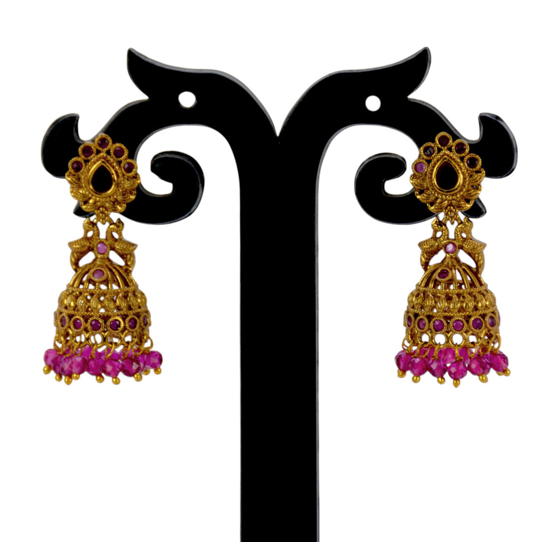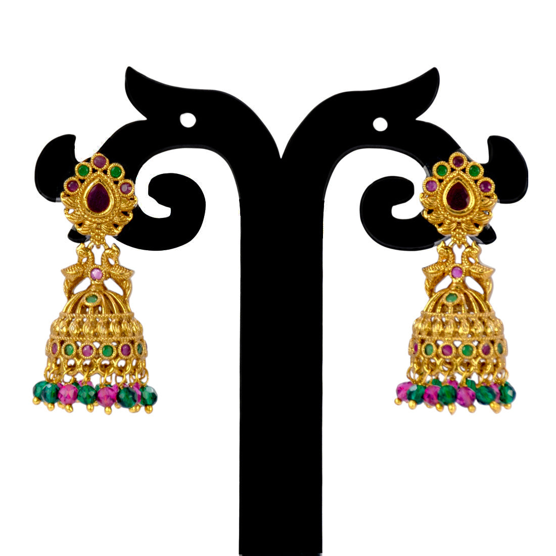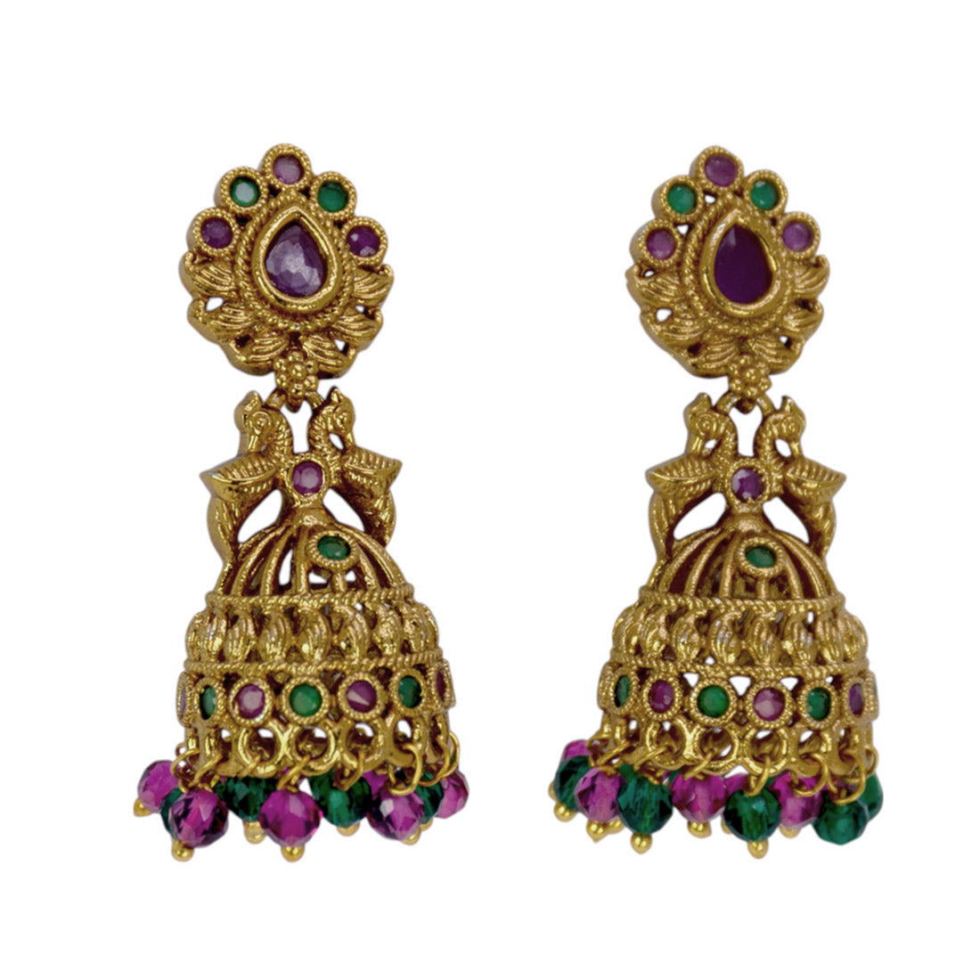 Add a touch of regal elegance to your ethnic wardrobe with these Small Antique Gold Plated Twin Peacock Stone Jhumkas, intricately designed with a classic twin peacock motif. The floral stud is beautifully adorned with rubies, emeralds, and sparkling white CZ stones, giving a vibrant look. The small dome-shaped jhumka features delicate carvings and matching stone embellishments that shimmer with every move. Perfect for weddings, temple functions, and festive celebrations, these earrings blend traditional artistry with timeless style.