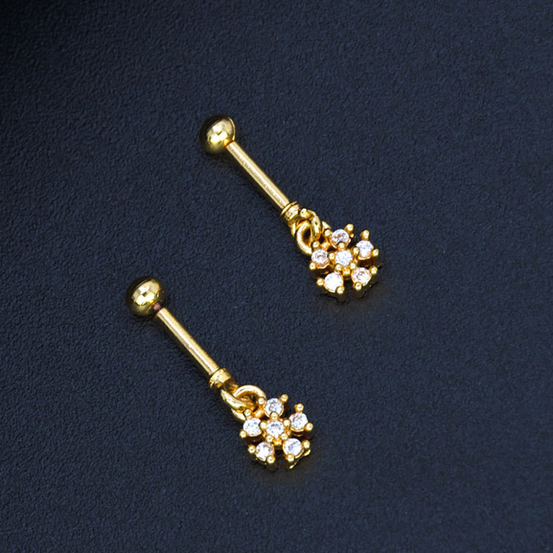 Small Floral CZ Gold Plated Bugadi Earrings featuring sparkling CZ stones in elegant small floral designs. Perfect traditional South Indian ear jewelry for daily wear and special occasions.
