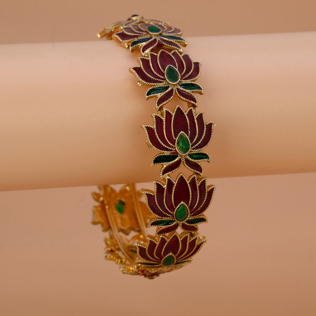 Celebrate tradition with this beautifully crafted Trendy Matte Gold Plated Stone Studded Lotus Bangle. Designed with radiant red lotus motifs with green leafs, this bangle captures the essence of cultural elegance. The intricate design and gold plating with matte finish make it a perfect accessory for weddings, festivals, and ethnic celebrations.